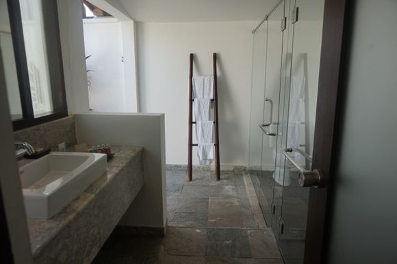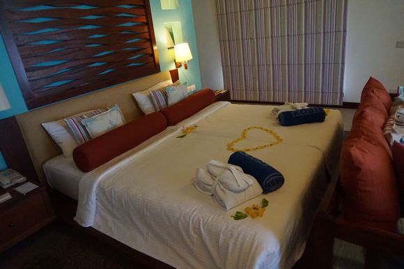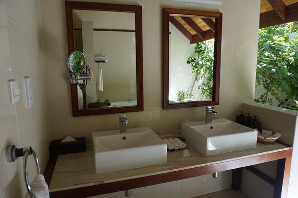 这个就是房间的后院了,2个洗漱池,一间淋浴室,一间卫生间,一个浴缸,一个室外淋浴,,一个衣物篮,一个晾衣架,一个凳子,洗浴池抽屉里面都是惊喜的,有吹风机,各种洗浴用品。衣柜里面有熨衣板的,还有救生衣,救生衣是不能穿着去浮潜的,浮潜需要去水上活动中心租借的。床上有一个魔鬼鱼玩偶的,可以带走的,带走是需要付费的,大概是及时美金的样子,这个钱是会捐献出去的。当地的一个手工艺品之类的。