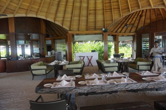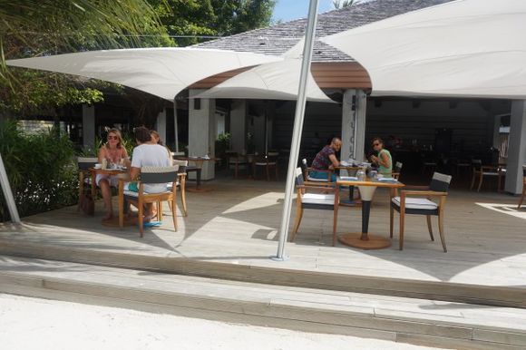 Sand Restaurant 这是栖息在纯白的沙滩上一处优雅的用餐地点,现场有伴着马尔代夫日落的热石烧烤和烹饪台。在大海的边缘,体会丰富多彩的时刻,释放自己的自然性情。我们的晚餐就是在sand restaurant吃的,这边主要是烧烤的,我们点了大龙虾,虽然照片拍的一般,还是很美味的。我们每人点了三道菜,分量很足,吃的很撑,不过马代的餐就是这样,吃的时候很饱,转眼就饿了。各种烤肉,烤虾,海鲜。马代的餐里面都有一种香料,植物的,特别香。夕阳渐晚的时候,小黑们就开始准备起来了,摆好桌子,,点上蜡烛,很浪漫的。