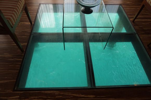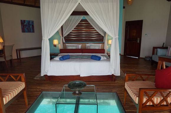 罗宾逊水屋的一大块玻璃地板,棒棒哒!这么清的水,一睁开就能看到这满眼有层次的蓝,真是太美了!