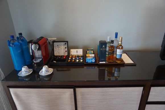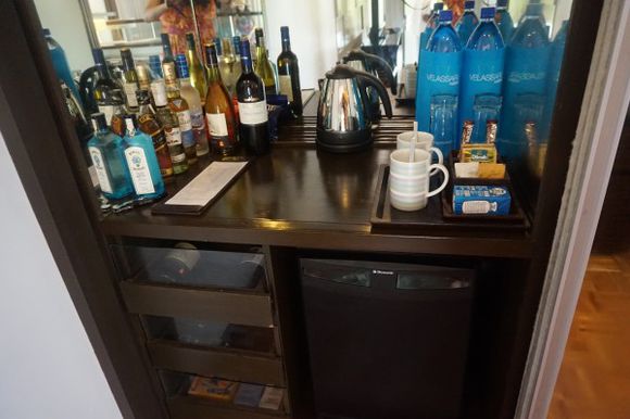 这个就是西餐厅了。西餐厅旁边有个酒吧。都喜天阙是有免费WiFi和免费水的,水喝完了可以续的,还有迷你吧的,咖啡和茶都是免费的,有的是需要收费的,管家会告诉你,哪些是free的。房间里面可以找前台或者管家要自行车的,他们会给您送到门口的,出去也可以叫bus的。来一张房间的图片。