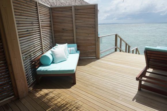 水上别墅,水屋里面的基本设施都是差不多的,多了私人泳池,多了扶梯可以直接下水的。现代室内设计,同时保持了自然的感觉,露天生活,沐浴在自然日光中,广泛的日光浴精美海景和最大的私人会所。