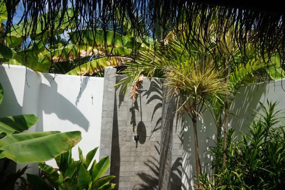 我们的后院。浴缸,室外淋浴,室内淋浴,洗脸台。