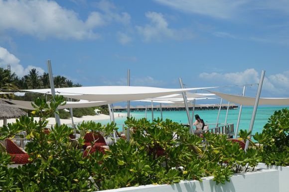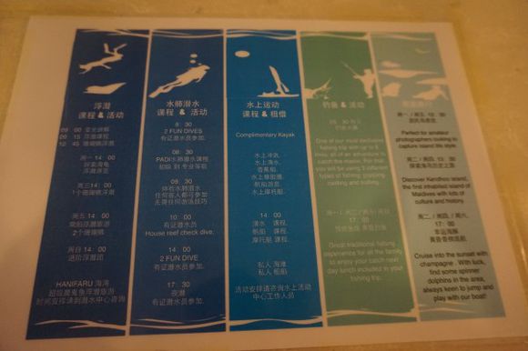 维拉沙鲁以白沙滩出名,沙滩很白,很细,光脚踩在上面,就是和大自然最亲密的接触。维拉沙鲁,性价比很高的岛屿,有免费水,免费WiFi,免费浮潜三宝的租借,岛上有5个餐厅,2个酒吧,我们的早餐和午餐都是在主餐厅Vela,早餐有免费的饮料,随便喝的,都是自助的,早餐我见的最多的就是鸡蛋,各种类半生半熟的,我实在不习惯,晚餐是在海鲜餐厅吃的,有大龙虾。小伙伴都说我们的图拍的一点都不高大上,请原谅我的技术了。