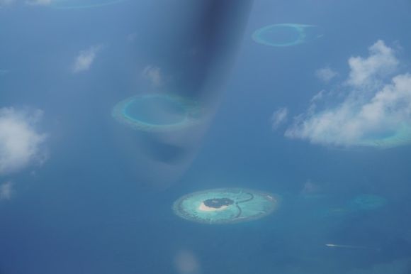 内飞看下面也是很清楚的呢,我终于知道为什么说马尔代夫是上帝散落的一串串珍珠了,在内飞上面看到的,这样形容是很准确的。wendy说,接下来我们来认岛吧,我一眼就看出了美人蕉。我们这次的旅行没有离开过机翅膀,只要是乘坐飞机都是在机翅膀上