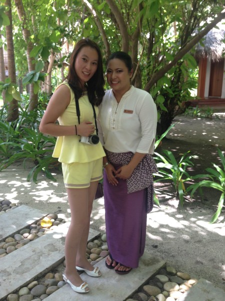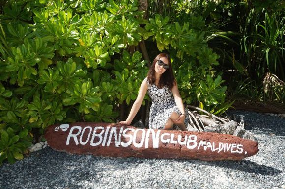 我和罗宾逊的logo合照的。 罗宾逊的前台办理入住。我们是上午11点多到罗宾逊的内飞,到达罗宾逊岛上是1点多,刚好还来得及吃午饭,我们办理好入住,就先去吃饭了。罗宾逊的主餐厅,午餐也是自助餐的。找了好久,没有找到吃的图片,吃完饭,就直接由我们热情的中文服务Anna带我们去逛岛。先带大家逛罗宾逊的水屋吧。用wendy来镇楼,哈哈。