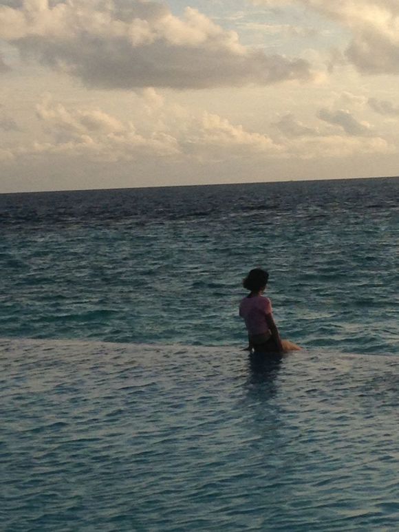泰国餐厅丰盛的晚餐,之前小伙伴们去,蜜月晚餐是可以选泰国餐厅的。很美味的,服务超好的,他们走路特别有意思,吃不完还打包帮我们送到房间里面的。分量超足的。我们第二天4点半起床,因为起床电话服务的,会把我们叫醒的,然后梳洗完毕,5点半管家来接我们去前台结账,管家给我们准备了贴心的,可以带走的三明治,然后送我们去码头,继续快艇转内飞,就下飞机后取好行李,dusit的小黑已经在出境门口等我们了,然后把我们送到维拉沙鲁的柜台,找到接机的小黑。 为了响应小伙伴们的要求,下面更新一些都喜天阙无边泳池的比基尼篇,哈哈,上图不说话:
