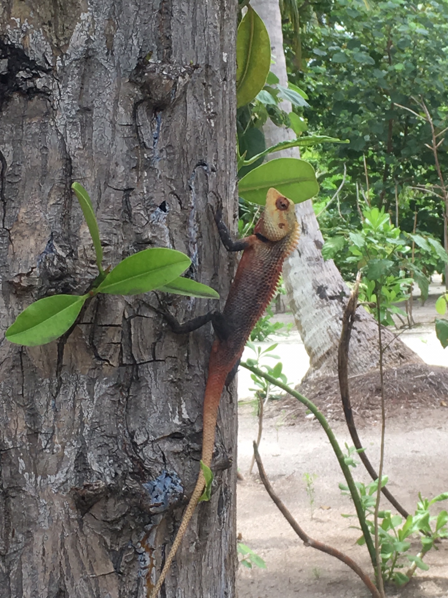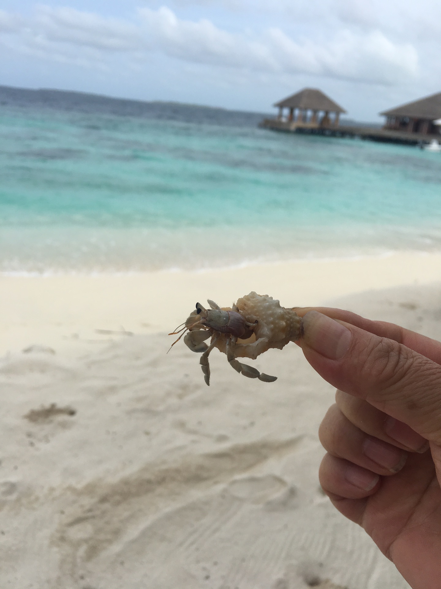 整个岛就是一个酒店,前台就是一个四面通风的大亭子很漂亮,当然check in时会有一个中文导游帮忙办理入住手续,会进行岛屿上的讲解。奇怪的是,库达富士岛和马累之间还有时差,比马累慢一小时。 中午导游会给我们一个小地图, 我的地图找不到了,凭记忆应该是这样的: 2号是个码头,快艇会在这里上岛,3号是前台办理手续,5号和10号是餐厅,5号的一价全包三餐都在这里,,4号和11号都是酒吧,6号是无边泳池(可以遥望大海)我们每天下午四点后点一杯果汁,然后安静的泡在泳池里,看着一望无际的大海,7号是商店,8号是活动中心里面有桌游,台球,健身等,9号是SPA馆,需要提前一天预订。12号是水上运动中心(所有水上项目都要去这里预定也可以跟前台预约,但是必须提前一天哟),13号是个网球场,14号是潜水中心(租借浮潜装备也在这里)。 我们预定的是两沙三水的房型,五个晚上。现在觉得那五个晚上过得是异常的快••• Here we go `` 在岛上唯一要担心的就是不要晒爆皮!那是非常非常惨的。 我们带足了防晒及修复。就怕一天下海之后,就成滚烫的红色了。这是我们的沙屋,沙屋前的海滩。真的是穿上泳衣直接下海的节奏! 真心的美丽! 真心的迫不及待!真心的喜欢!第一个发现的就是贝壳蟹,专业名是不是叫居寄蟹?还有来回攒动的蜥蜴 ,哈哈。