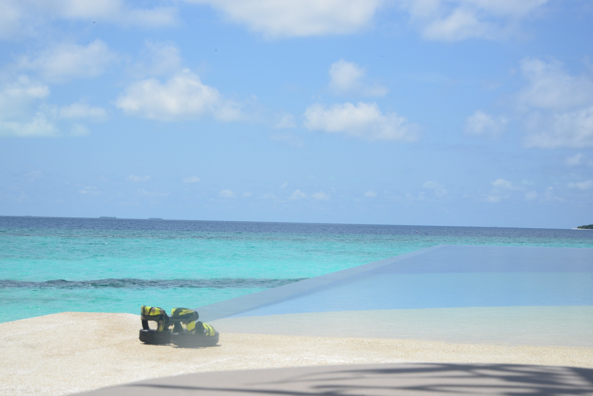马尔代夫 JA玛娜法鲁无边游泳池听我们的管家说,之前的沙滩是和无边游泳池一样的长应该是长年浪打浪打,所以沙子都被吸走了~~