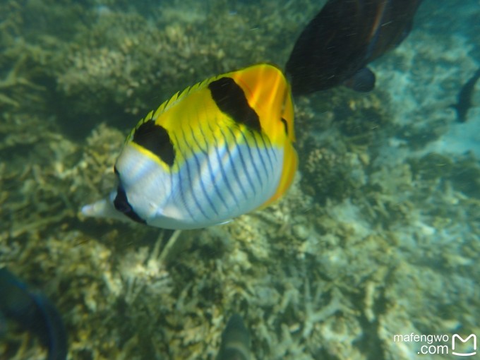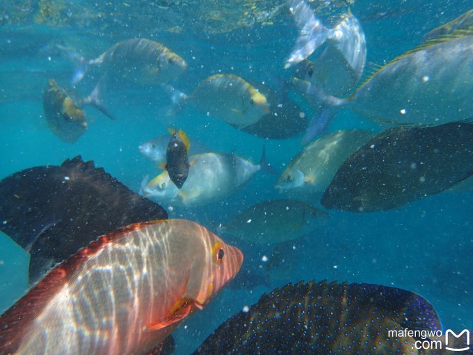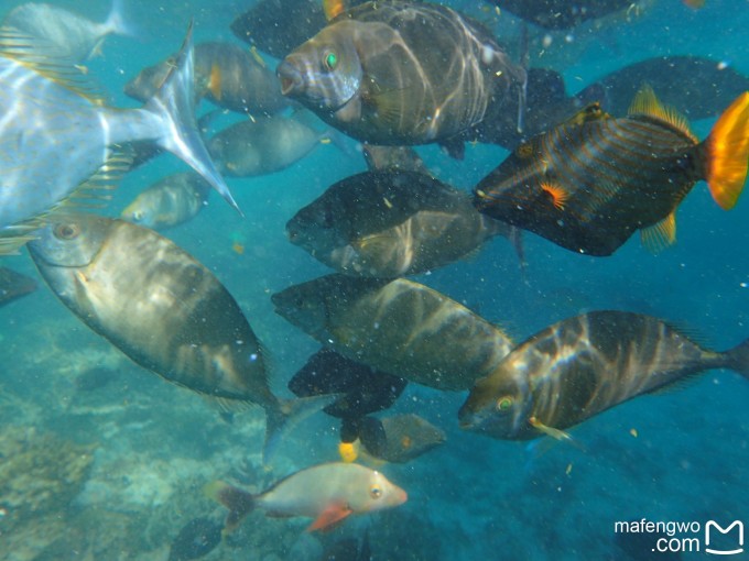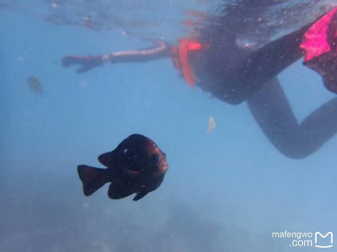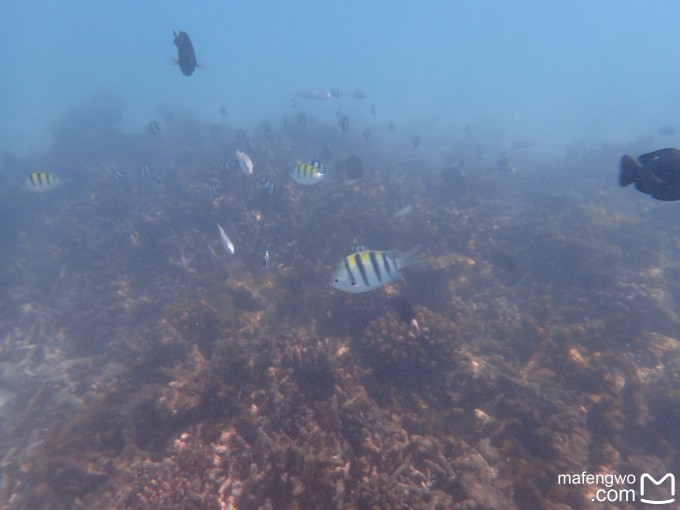 不过仅仅这样浮潜肯定是对不起格兰德浮潜A级的标准的。据说家庭房下面珊瑚很多鱼很多,可我不会游泳,要从海滩上游过去比较难。豪华夕阳泳池别墅跟前就是珊瑚,离我们的房间也比较近,后来我们一直就从53号房前面的小楼梯下水,游到53号房旁边或者前面的珊瑚那里浮潜。不过要注意,旁边的54号房前的珊瑚礁都露出水面了,很容易划伤。后面两天浮潜时风浪大,很容易被浪推到礁石上,老公那稍微会游点泳的都不敢往跟前凑。话说这些房间真不错,基本上坐在台阶上就能清楚看到眼前的鱼。 我们发现风浪大的时候,这边的鱼更多,应该是被海浪推过来的,而且一尺左右长短的鱼非常非常多,稍微带点鱼食下海,一群大鱼就会绕着身体旋转抢食,此情此景,唯有亲眼所见才能感受。 请看漂亮的blue Jack↓和直奔着鱼食去的呆萌小黑鱼↓,还有各种为了鱼食抢镜头的鱼