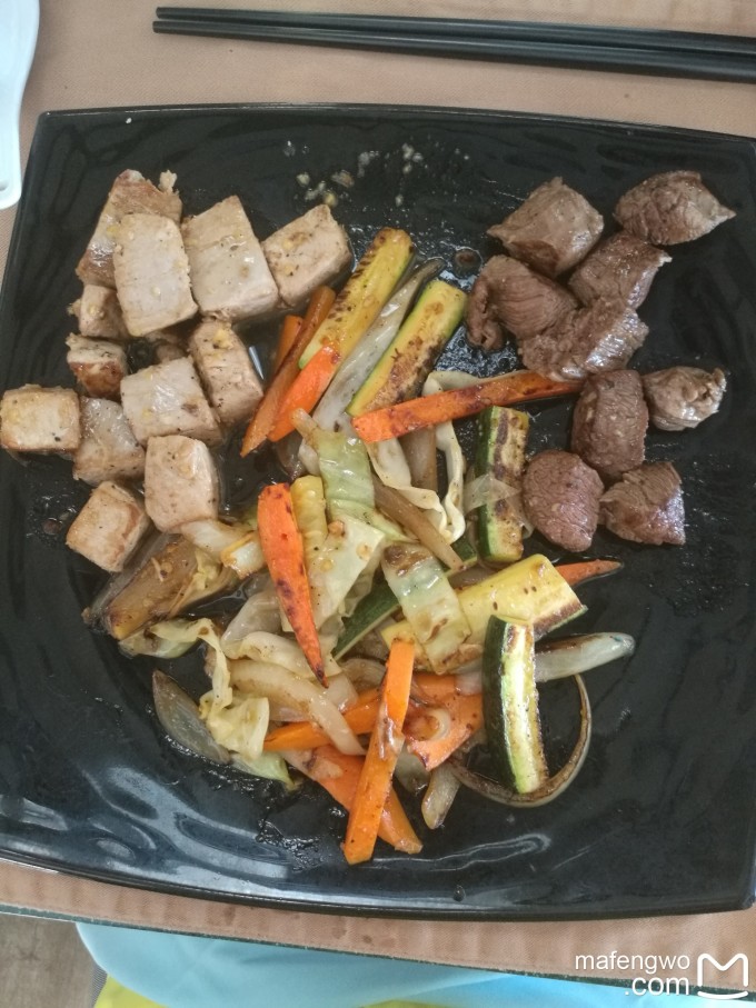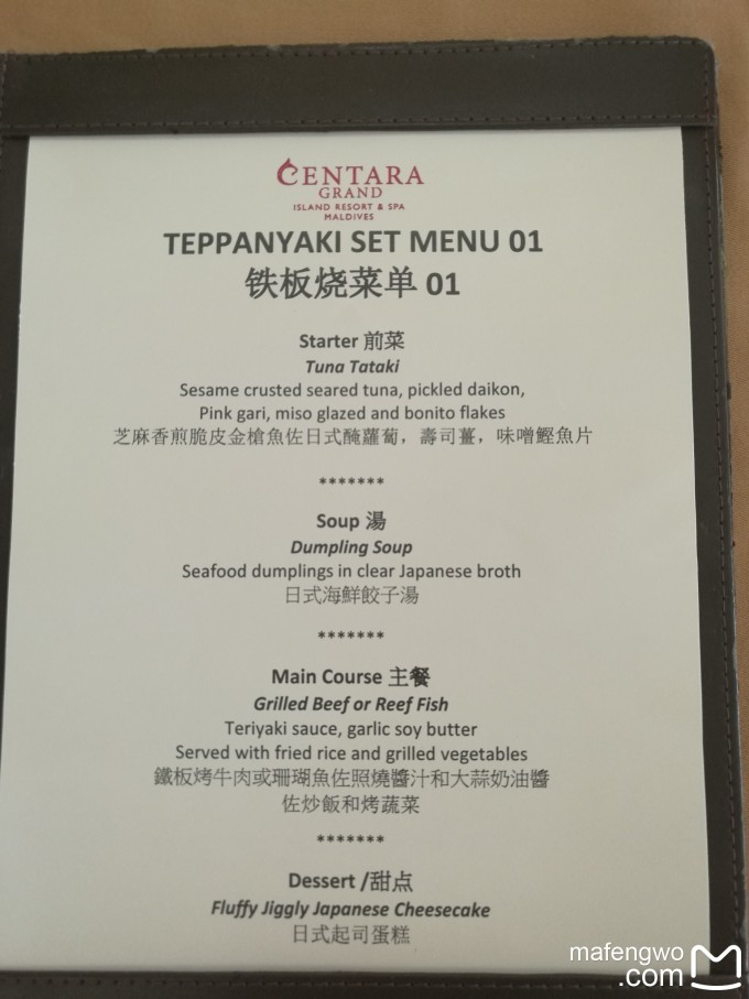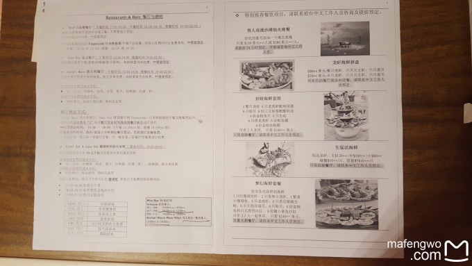 2.日式铁板烧 主餐厅里单独的一块区域,我们是中午去吃的,居然整个中午只有我们两个人在那里吃。好像还有两个人预订了,但没去。如果预定了不去还没有取消,好像是要扣钱的呢。但厨师没接到通知,于是说我们很幸运,把多的鱼肉和牛肉都给我们了。根本吃不下的好嘛~~~不过牛肉不知为什么有些嚼不烂,没有别人说的那么好吃。但炒饭和甜点很好吃。尤其是甜点。 下面是我们吃的菜单,中午晚上应该不一样。炒饭没拍到。