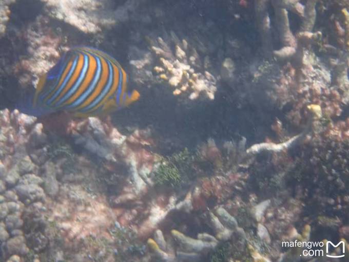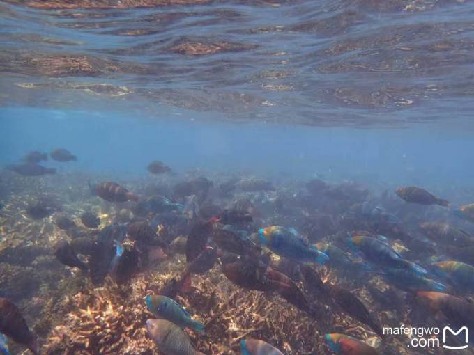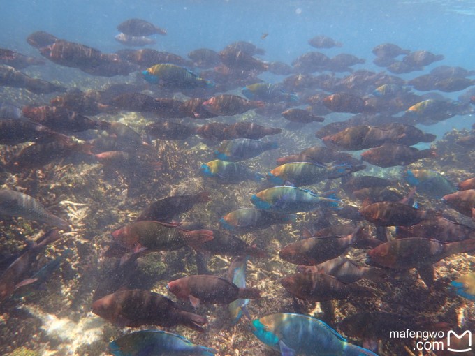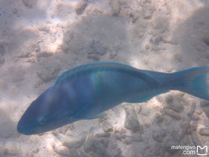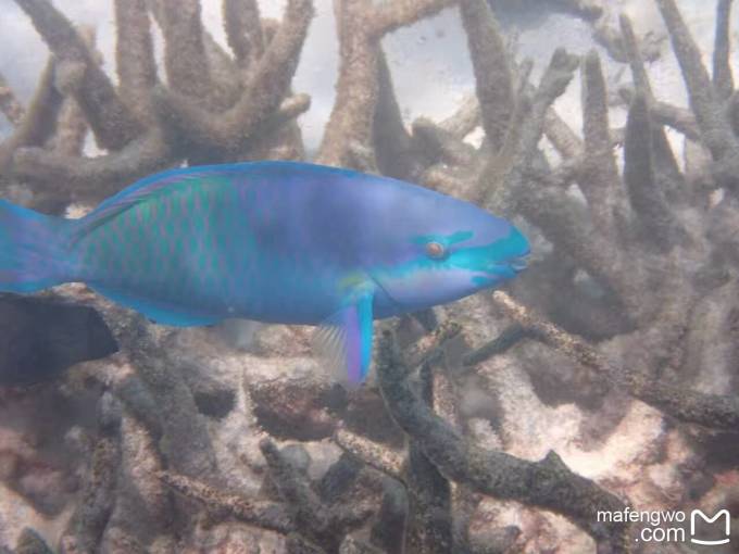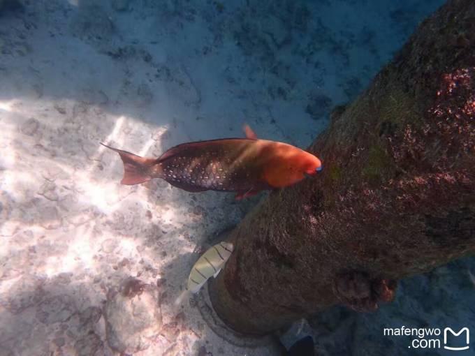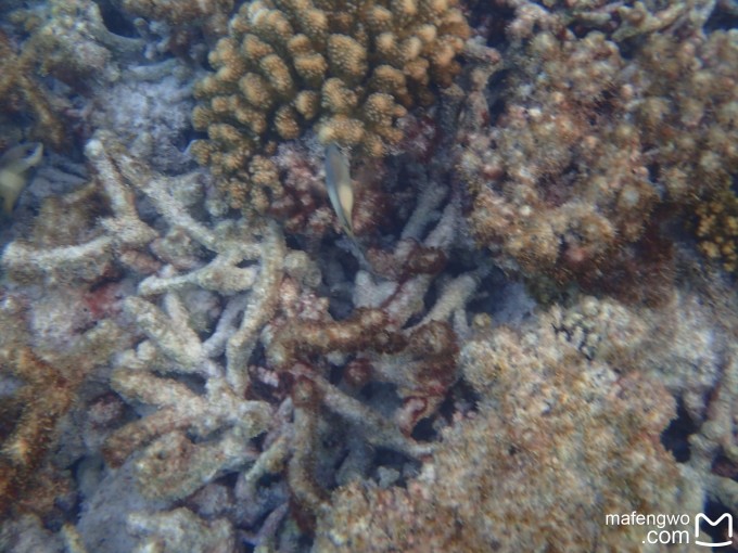 还是53号房的附近,浪大的一天,老公往海里的珊瑚中深入了一点,我没敢跟去。结果老公看到一个鱼群穿过珊瑚礁缝隙的景象,据说怎么着也得有几百条鱼在水面下游过,想想都够震撼的。可惜没录像,不过照片也够棒的了。