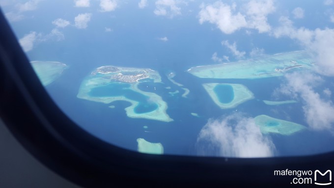 从马累机场岛到中央格兰德岛上的还内飞加快艇上岛的。代理说添钱可以换水飞。我们没有换。内飞一样可以看到印度洋上的点点珍珠,还能看到大的环礁的形状。我觉得还是很好的。内飞的空少还很帅,给我们每人发糖果。