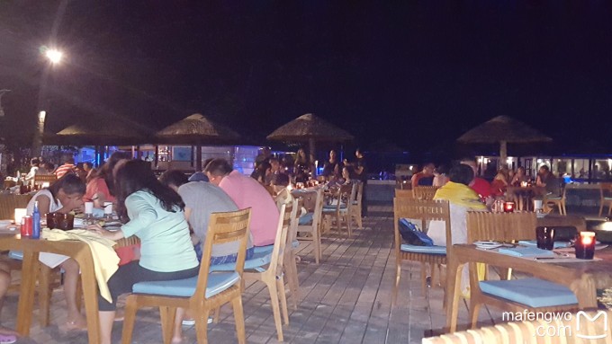 中午和晚上就可以点blue ocean一类的无酒精鸡尾酒了,老公最喜欢这个饮料,我觉的没有带芒果汁和菠萝汁的好喝。岛上无酒精的鸡尾酒只有六种,在水吧和珊瑚吧营业时间内随时都可以喝到。 每天晚上,Reef餐厅的晚餐风格都是不一样的,第一天大概吃的是东南亚风格的东西,真心对那些肉的做法不喜欢。不过吃吃其它的也就饱了。再就是,建议不要尝试奇怪的香料蘸酱等等。某天早上尝试了一颗没见过的豆子,咬了一下就后悔了,直接吐了。 ↓晚上的Reef餐厅露天就餐区。还是建议不要坐在太靠外的位置,忙起来的时候服务员根本顾不到这边,要了三次饮料才送过来。。。而且,我觉得服务员还是偏向于先服务西方客人的。