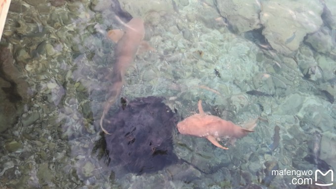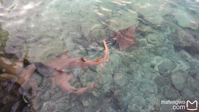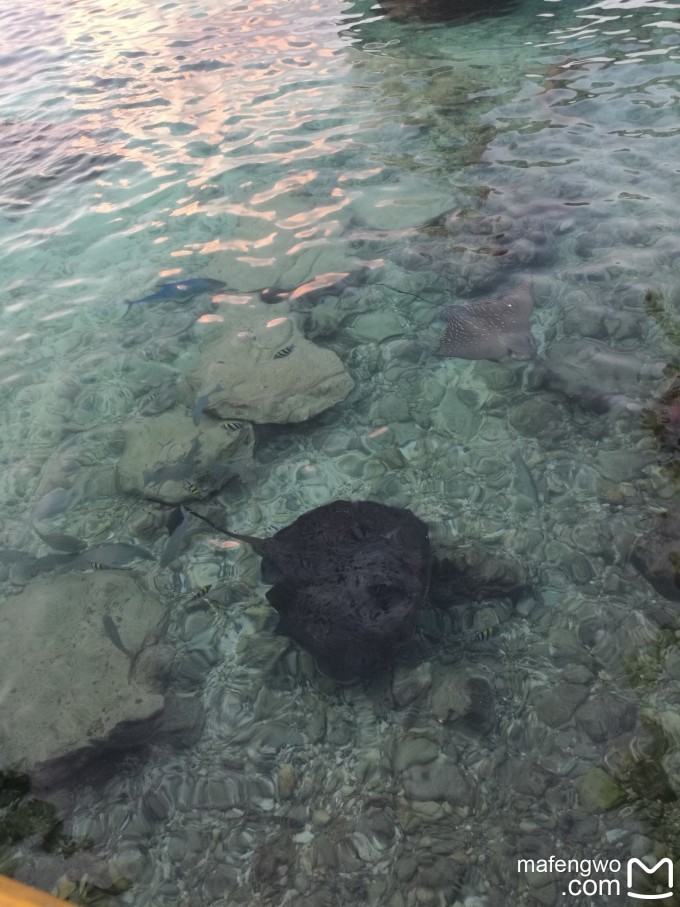 每天晚上18点,珊瑚吧都有喂鱼活动。还不到18点,就有几条两米左右的鲨鱼、一条鳐鱼、一条黄貂鱼以及几条blue Jack、baby shark还有若干小鱼聚集在此。有一天看到了5条鲨鱼,还看到了 一条鳗鱼。看到别的攻略说有魔鬼鱼,但其实现在是没有的。 喂鱼的时候还有乐队在旁边演奏唱歌,很不错。这个乐队还出现在晚上的Reef餐厅和意大利餐厅。