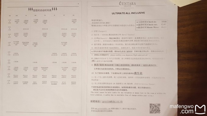4.游泳装备:水母衣是必备!除非想充分接受马代阳光,晒成黑球的,不然还是老实的穿水母衣下水吧。比基尼也就拍拍照穿,根本不适合下水浮潜用。浮潜用的呼吸管和面镜最好还是自己带,中央格兰德浮潜三宝(呼吸管、面镜、脚蹼)是可以免费租用的,但租的面镜带的人多了容易松,会进水的,对不会游泳的人来讲是很影响浮潜体验的。我还带了浮潜手套、短脚蹼、潜水袜全套。虽然有点多,但都用上了,老公在珊瑚中浮潜时被海浪推到了礁石边上,不是穿戴整齐,脚一定会受伤。我的水母衣袖子不够长,和手套之间露出一块手腕,结果下水一次就晒出一块“黑色护腕”来,还因为被海浪撞到水屋的台阶上划伤一道。 5.水下相机:必带!!!我们带的奥林巴斯不是特别好,就不推荐了。 6.U型枕:我坐的是东航。从上海到马累段的航班有靠垫和毯子,人手一份,枕头就没用上。从上海到家的一段倒是用上了,不过就一个来小时,拿不拿都行了。 7.蜜月礼物需要的结婚照复印件:我们去度假时刚过了登记日期半年,结果万能的旅游代理帮我们P了结婚的月份,我们就又能用啦!不过,没有见到传说中的果盘,送的是气泡酒和一小碟(4颗)巧克力(见下图冰箱里的),也没有鲜花铺床。我们在床头留了小费了也没用,大概鲜花铺床需要特别要求?不过这个不重要了。
