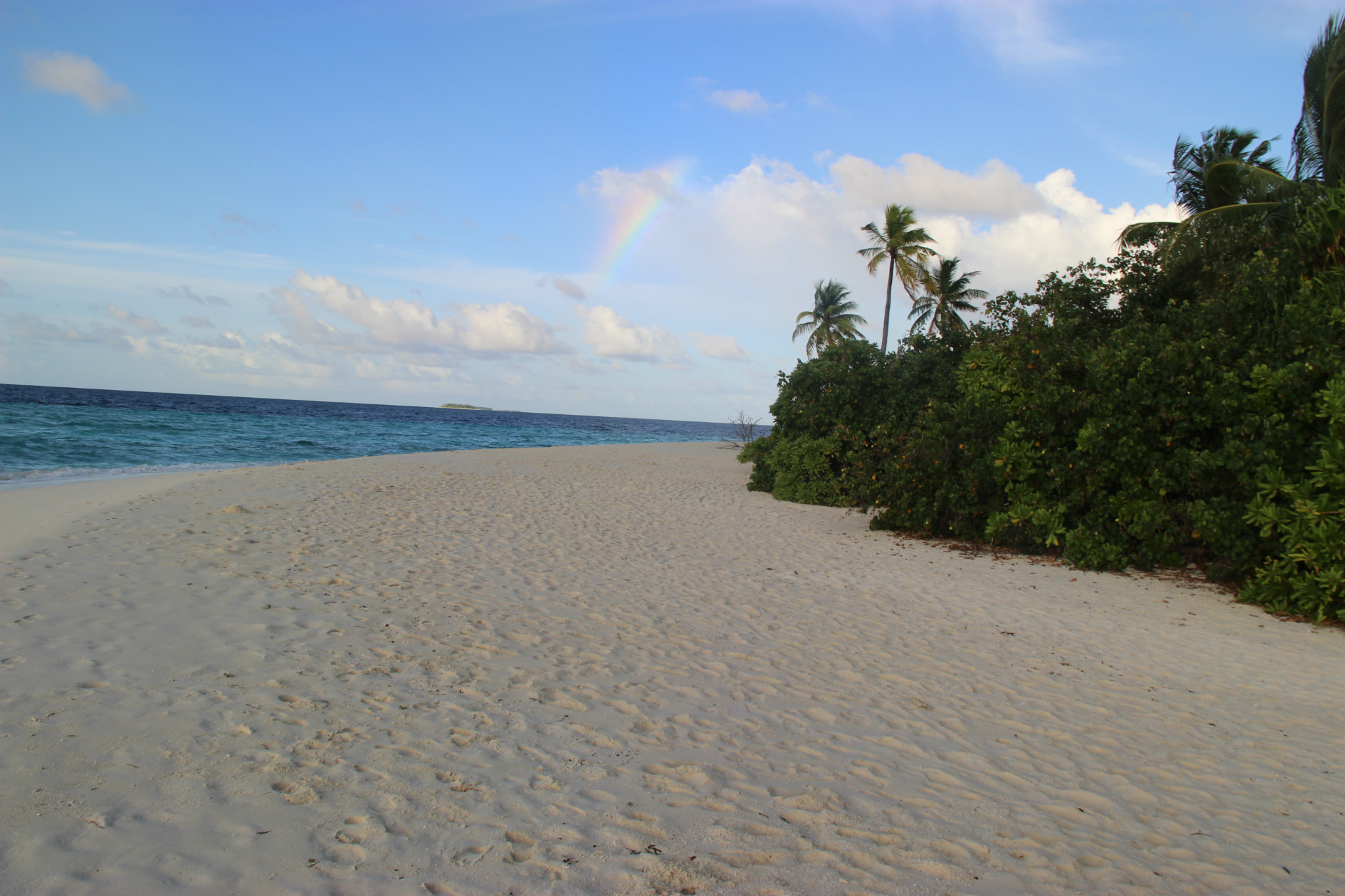 7.31今天中午十二点我们就要换水屋了。昨天晚上小黑已经将通知放在床头。我们只需要把行李整理好放在房间门口,然后拿着房卡到前台办理一下手续就好了。早上我们仍然起来的非常早,我拉着老公去外面的沙滩漫步,连特别爱睡懒觉的老公都觉得这样的生活实在太美好。上天也对我们不薄,竟然让我们看见了彩虹!还看见了两条可爱的小鲨鱼,所以说,早起的鸟儿有虫吃!哈哈。