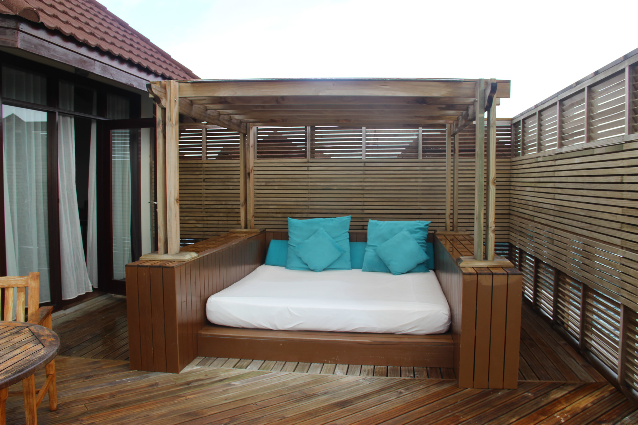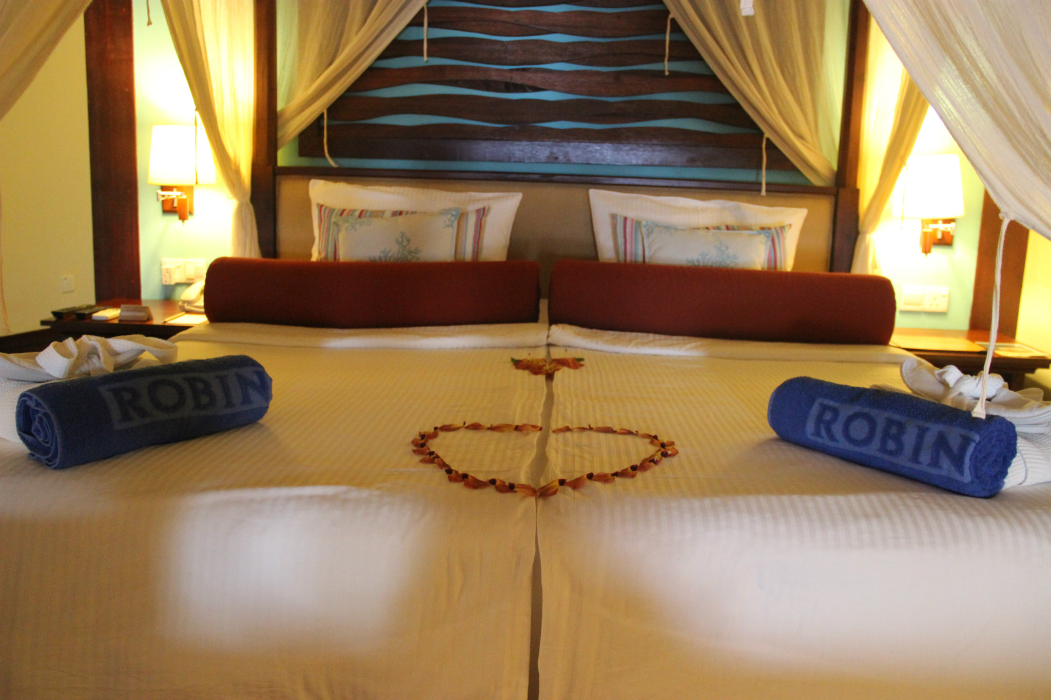 R岛的工作人员在主码头热烈欢迎我们,为我们献上了岛上自制的小礼物和香槟。岛上的中文GO叫Anna,她带着我们到前台等候check in。我看过很多关于麻袋的游记,又重点关注了R岛,所以岛上的一切我都有种熟悉不陌生的感觉。在订房间时Wendy有帮我们申请蜜月房,在这时候就要将结婚证复印件交给Anna或者出示原件给她看。一切搞定!