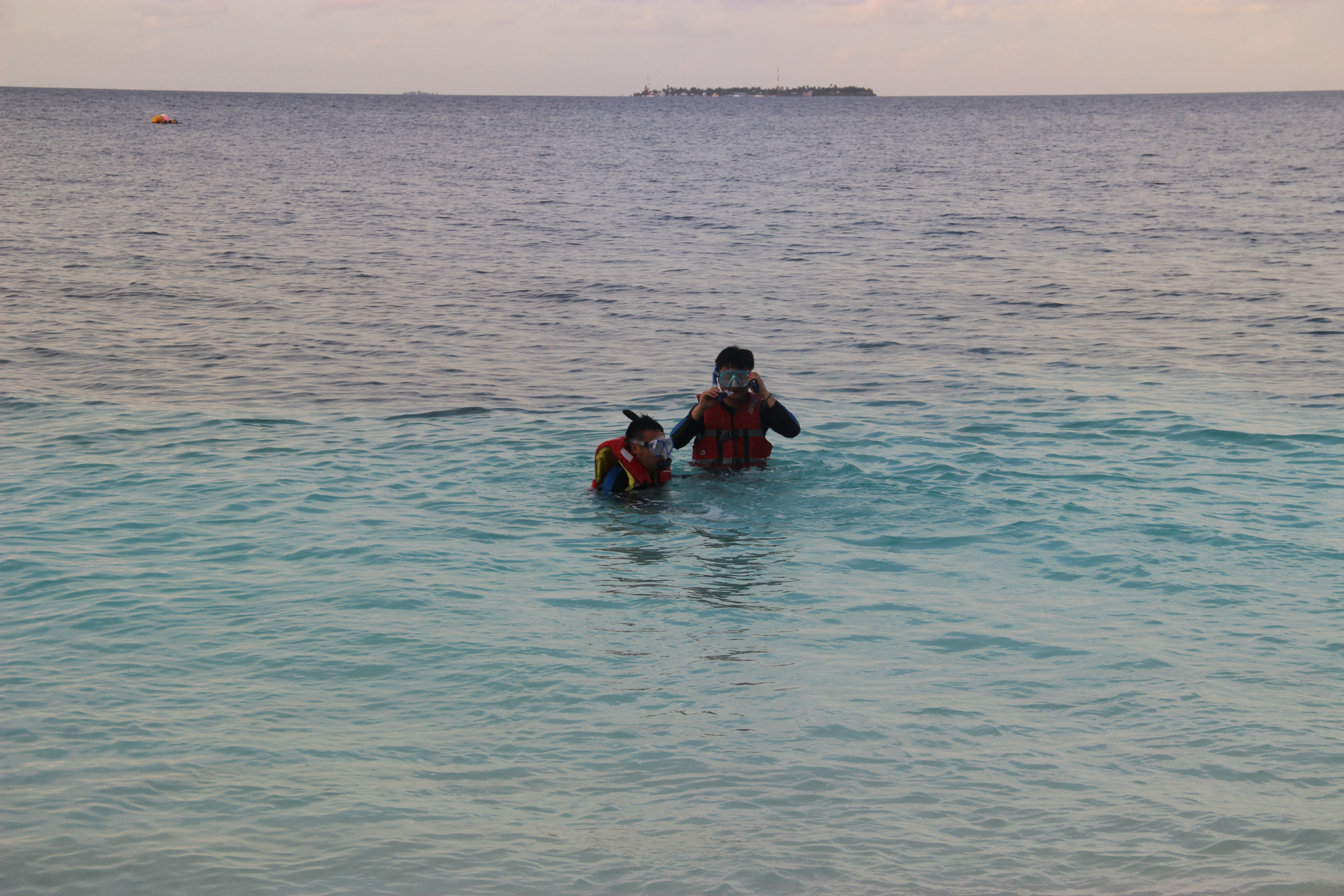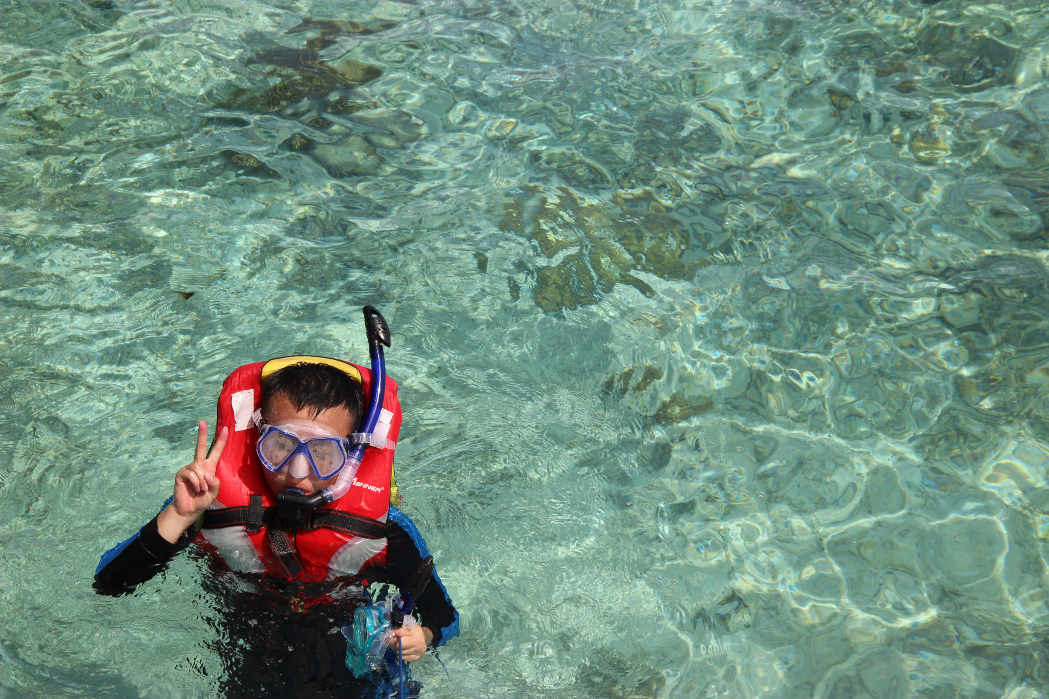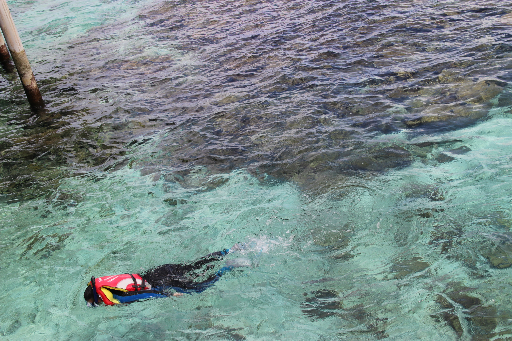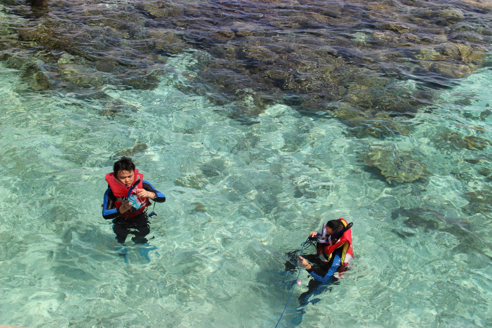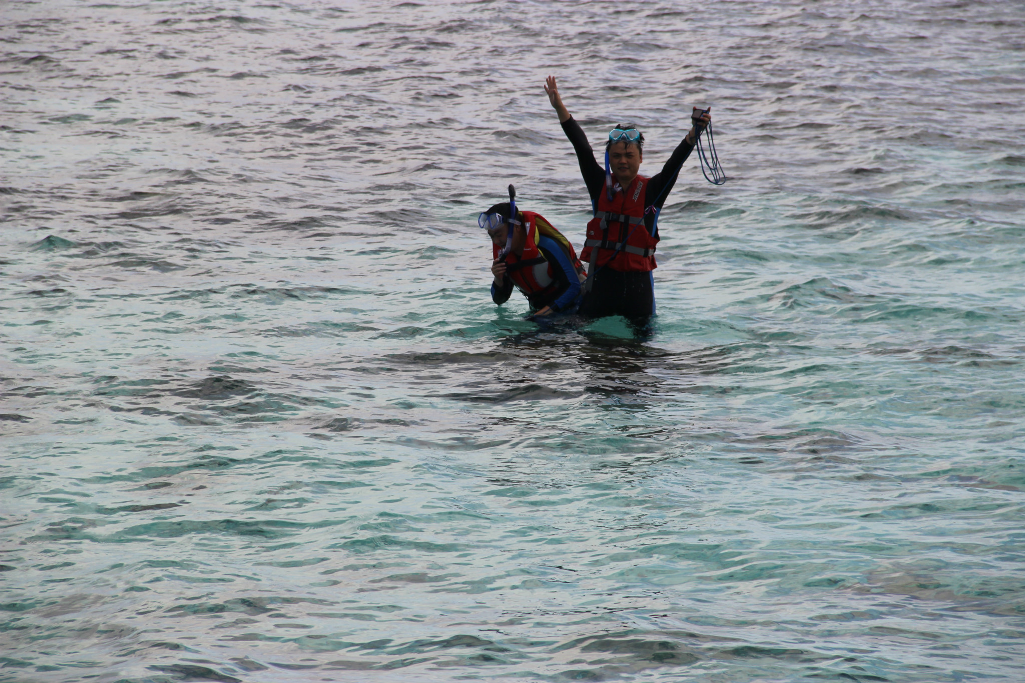 中午太阳太大,我们就休息了一会。下午我们一起去租借了浮潜用品,水母衣和呼吸面罩、呼吸管都是我们自带的,于是我们在那边只租借了脚蹼和救生衣。建议大家一定要买潜水袜,以免被珊瑚刮伤,即使有脚蹼,裸露在外面的皮肤也很危险。等到太阳小一点了我们就开始下海。。。