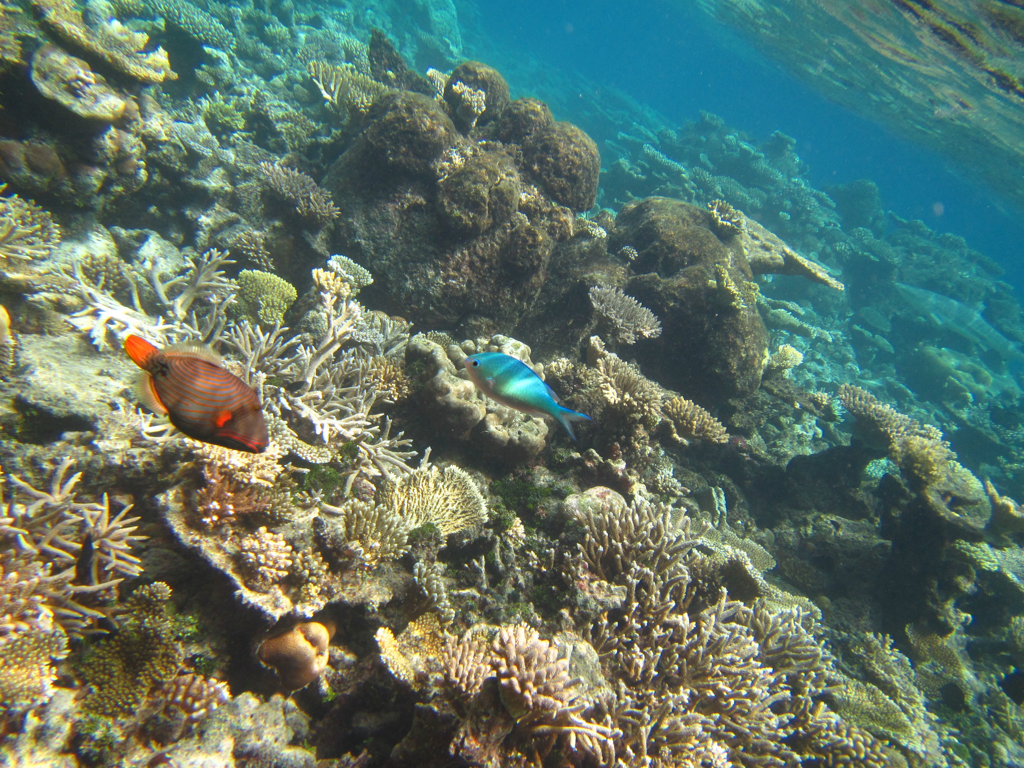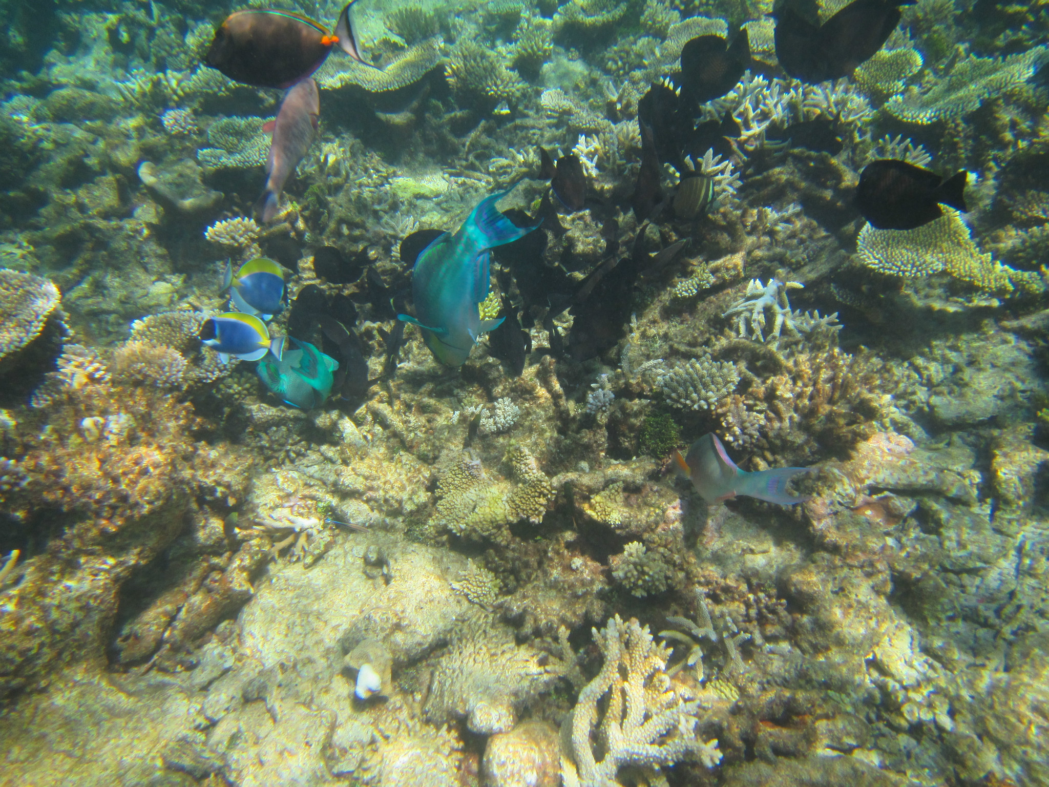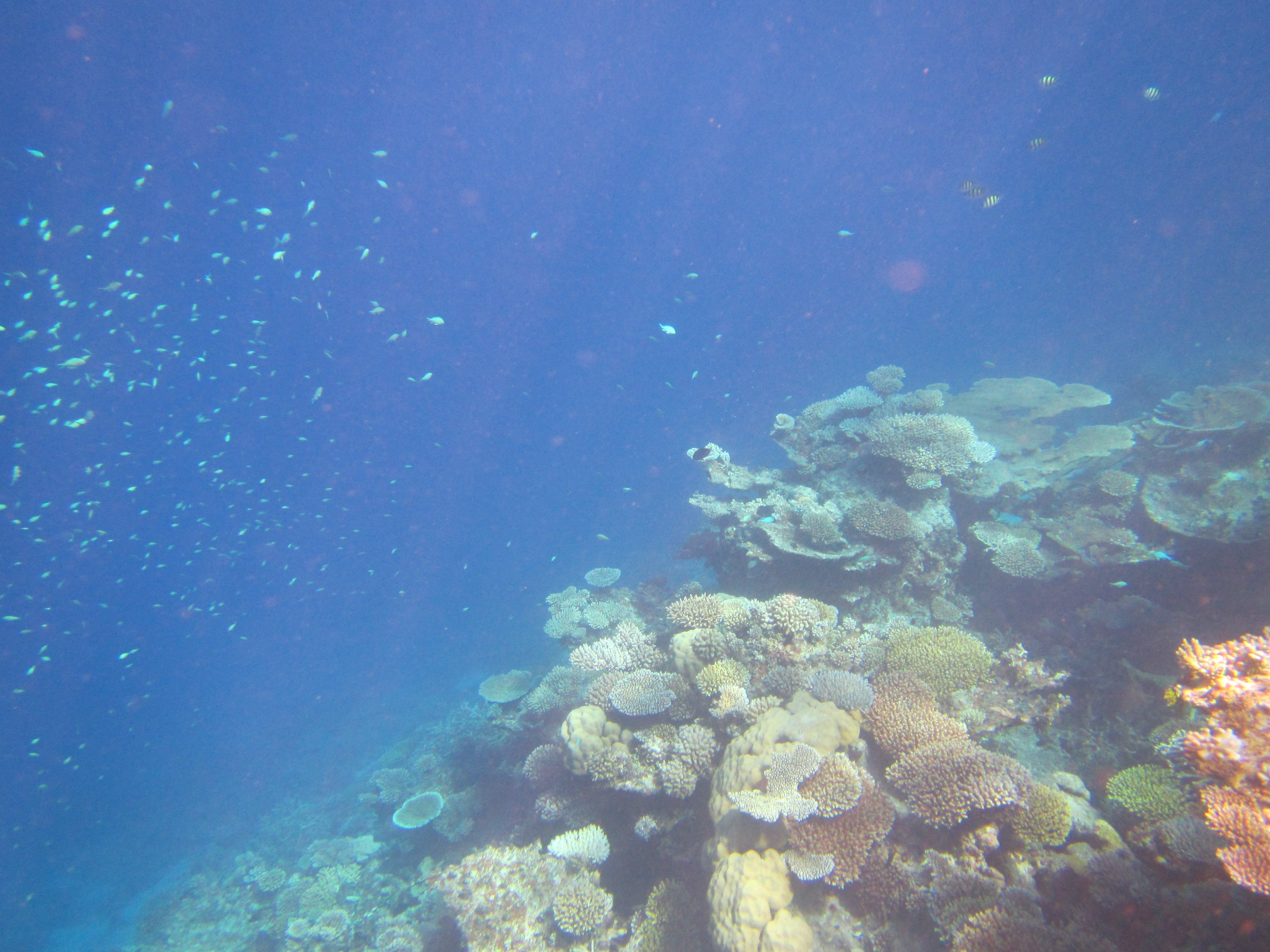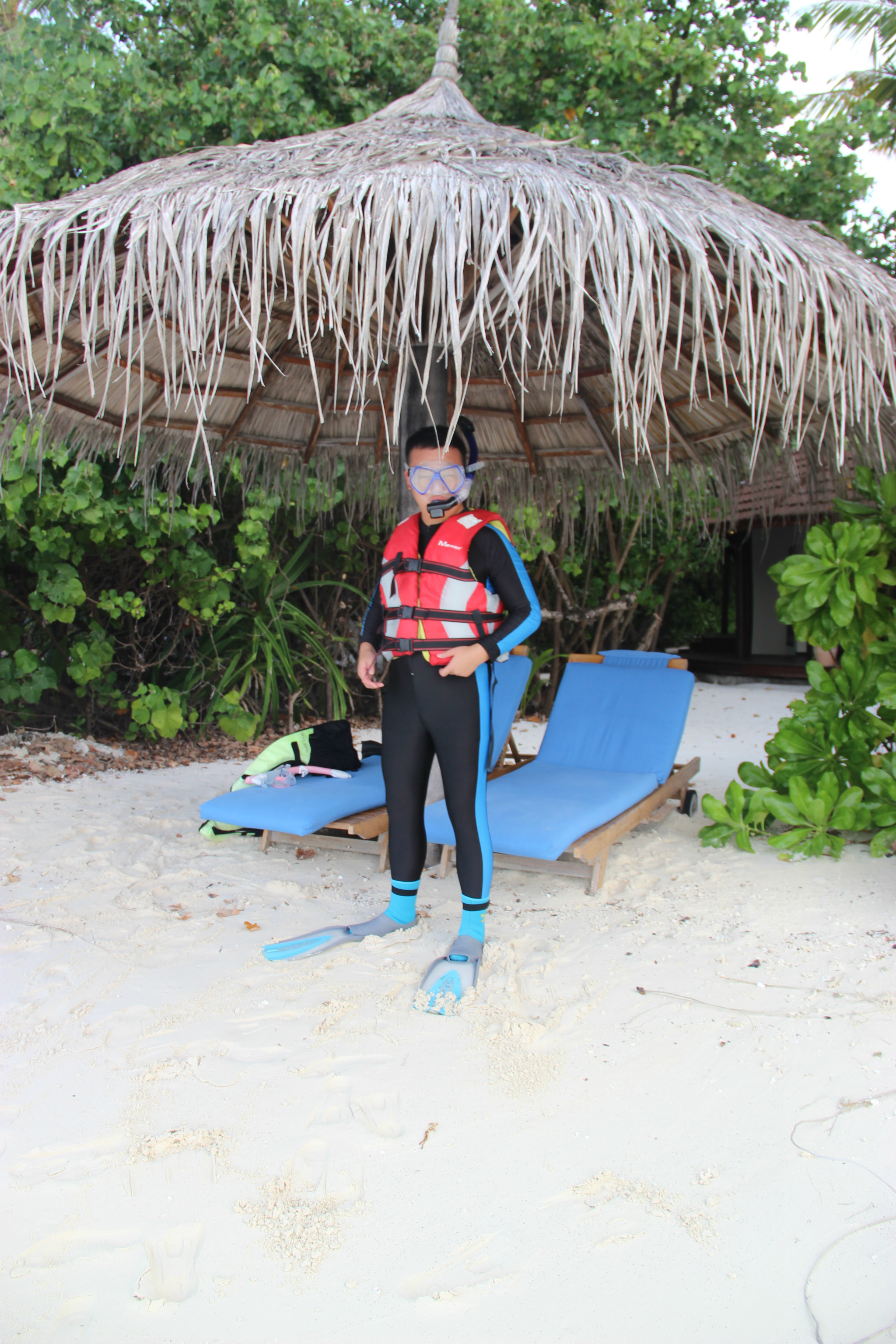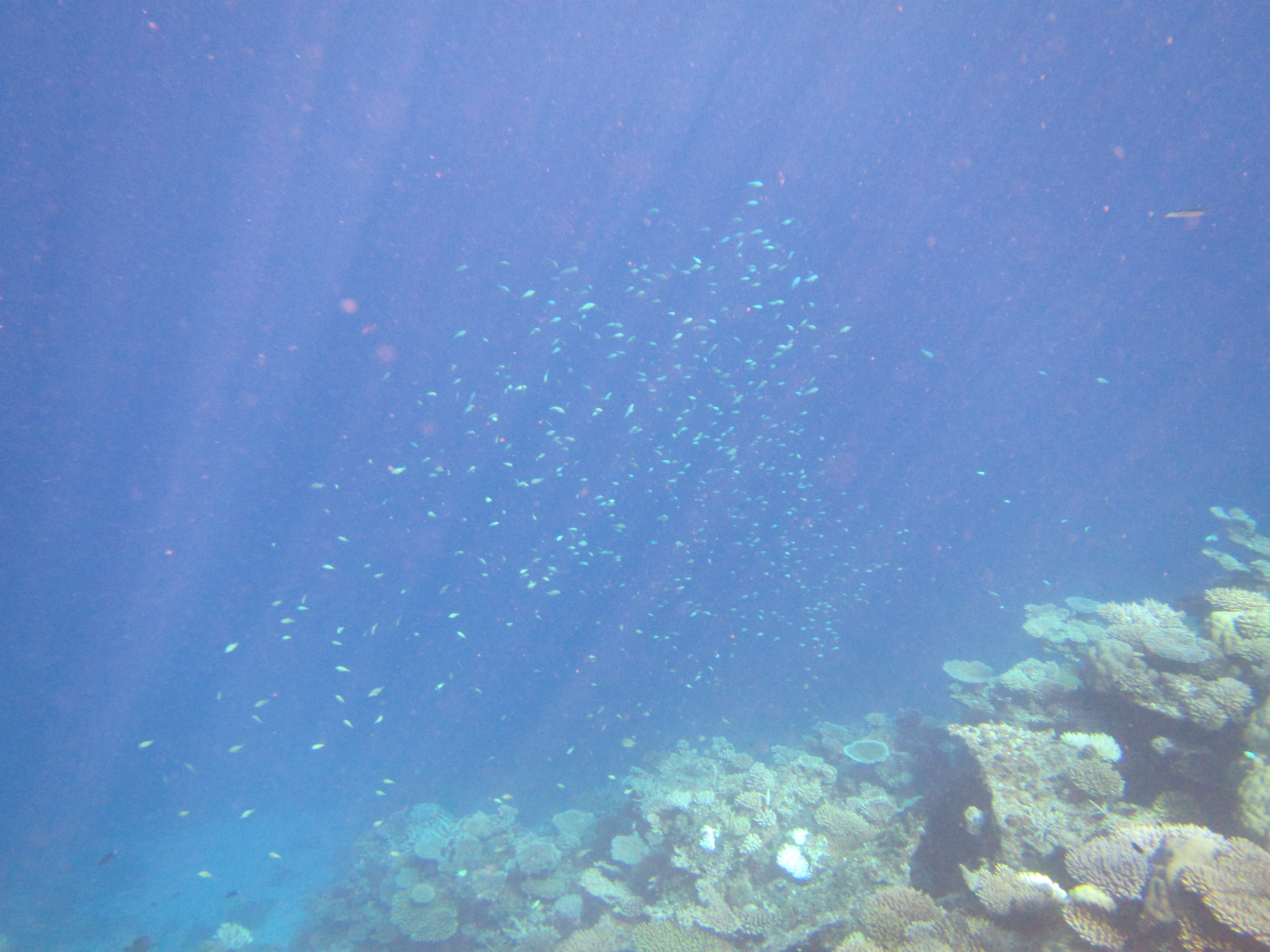 中午太阳太大,我们就休息了一会。下午我们一起去租借了浮潜用品,水母衣和呼吸面罩、呼吸管都是我们自带的,于是我们在那边只租借了脚蹼和救生衣。建议大家一定要买潜水袜,以免被珊瑚刮伤,即使有脚蹼,裸露在外面的皮肤也很危险。等到太阳小一点了我们就开始下海。。。
