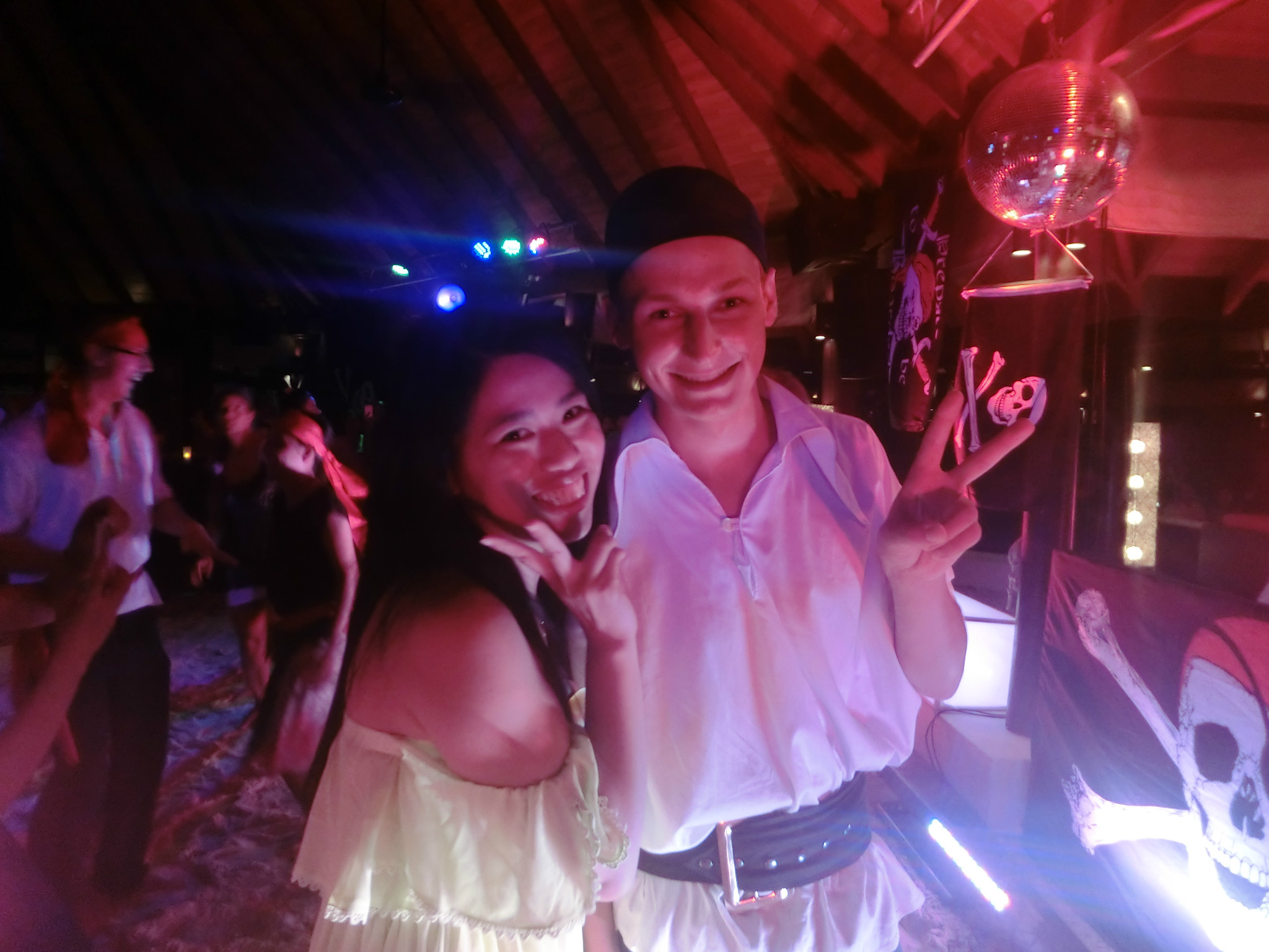 每天晚上R岛都有不同的主题party,地点一般都在主酒吧,小黑会将第二天的活动表放在床头,可以自己选择参加。如,7.29晚上是赌场派对,只要在酒吧中点一杯饮料就能换两杯饮料,同时还能换得赌场的筹码参与押注。获得筹码最高的人有奖励。今天晚上的活动是海盗之夜,大家齐聚主酒吧热闹起舞,后来才知道在酒吧跳舞的大多都是R岛上的工作人员。参加晚上酒吧活动的大多都是外国人,他们玩起来非常嗨,不过我们今天晚上也得到了完全的放松。