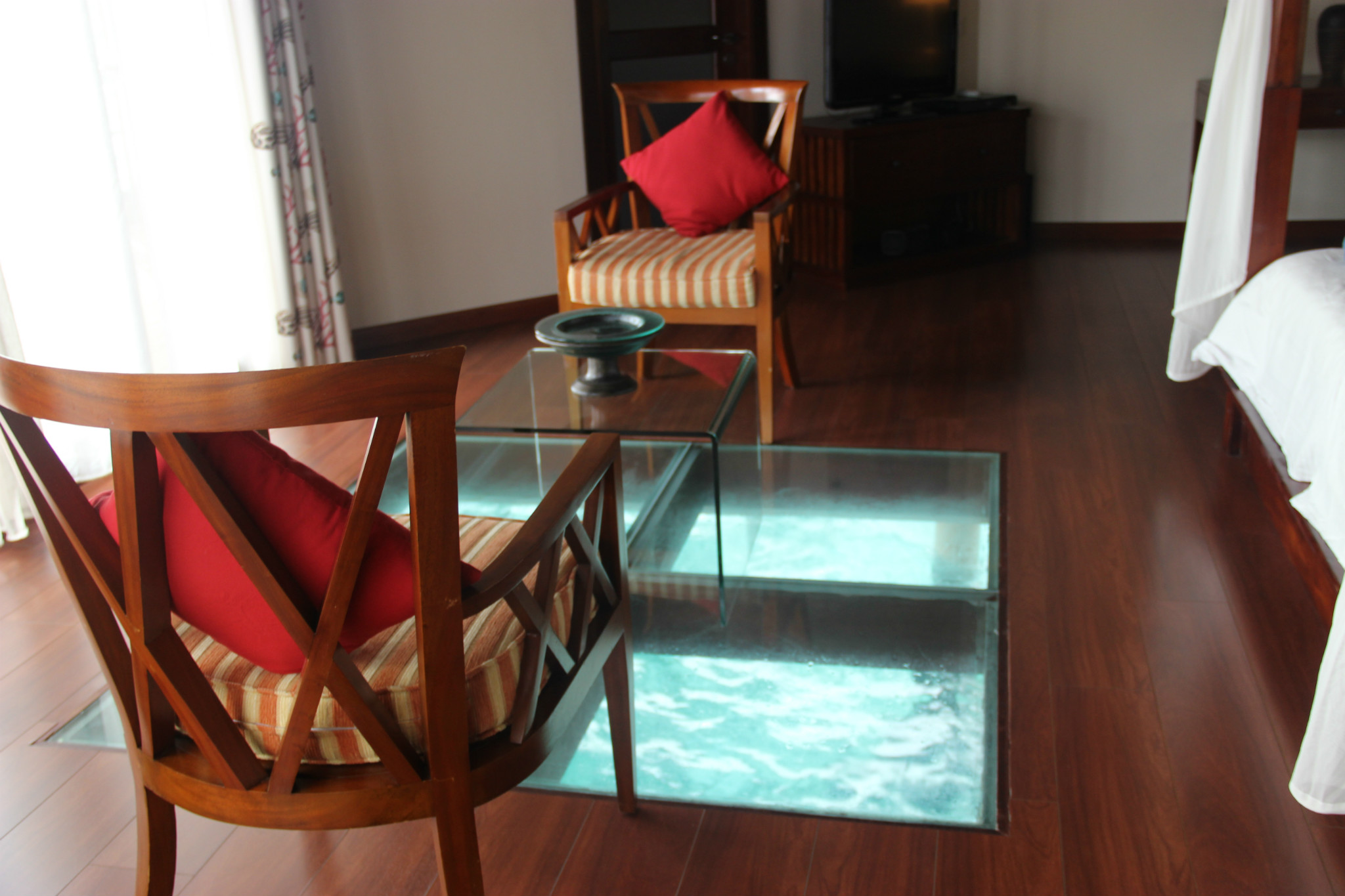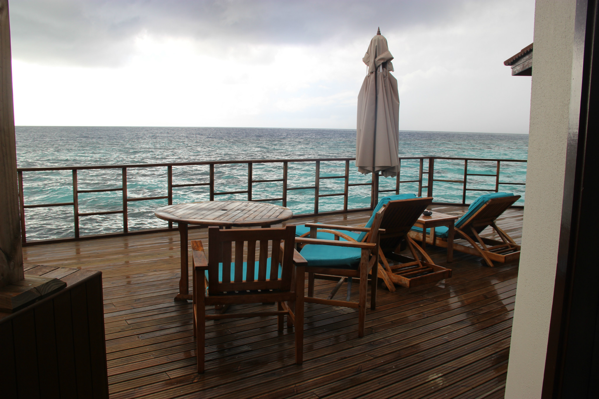中午我们去换了卡,就去水屋啦。我们的水屋房间号是1104,离总统套最近的在1102和1103,其次就是1104,换句话说,就是延伸到海中间最深的地方之一。所以,对这个房间我还是相当满意的。走进去之后真的非常惊喜,我特别喜欢那个超大的露天阳台,虽然没有私人泳池,但是一下楼梯就能下海。