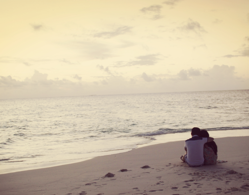 我拉着老公坐在沙滩边上,看着浪花向我们这边涌来,看着太阳慢慢慢慢落下去,时光何其美好。突然,我感觉到幸福就是这样,有爱的人的陪伴,一起看着最美的景色,于愿足矣。