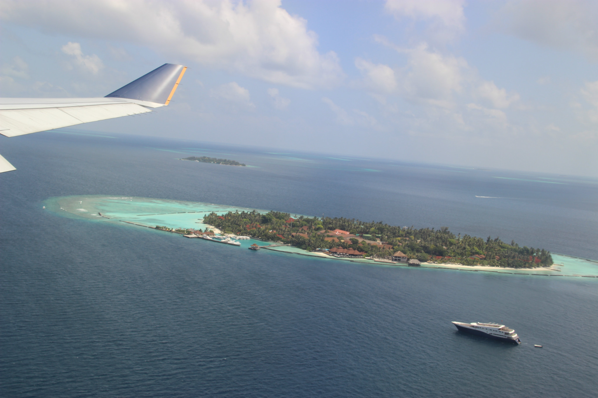 7.29上午11:30我们到达了马累。这个时间是马累时间,时差比北京时间晚三个小时,所以不要以为新加坡到马累只需要1个小时哦,是我们赚了三个小时而已。马累机场很是简陋,但是外面的海水幽兰美丽,振奋人心。到出站口的时候找到了穿蓝色衣服拿着Robinson牌子的小黑,非常热情地带着我们去站点要我们等待一会,等他把一同上R岛的游客接到了再去内飞休息室。就这样,我们还碰到了一对邵阳的90后小夫妻,一见已经觉得超级有缘,后来小罗成被封为表情帝和动作帝,在岛上的几天时间给我们带来了不少欢乐。只是他们在R岛有7晚,顿时有些羡慕。就在老乡见老乡的兴奋时刻,小黑领着今天一同上岛的客人来了,带着我们一块去内飞休息室。只要把护照直接给他,在内飞休息室等待就好。内飞休息室里有wifi,吃的喝的一应俱全。大概等待了一个多小时,我们就开始登机了。在这里,跟老公同志大吵了一架!男人们在外一点都不操心根本就是依赖思想,后面的行程完全证明老公是可塑之才,完全能将上上下下打理得非常妥帖,我也就不生气了。内飞就是小型飞机,大致能坐60人,我们到中转岛的内飞时间大概是一个多小时,再从中转岛坐快艇到R岛大概是20分钟。在内飞上我看见了印度洋上散落的美丽珍珠,水飞视角可能会更好,但是内飞也不差啦。