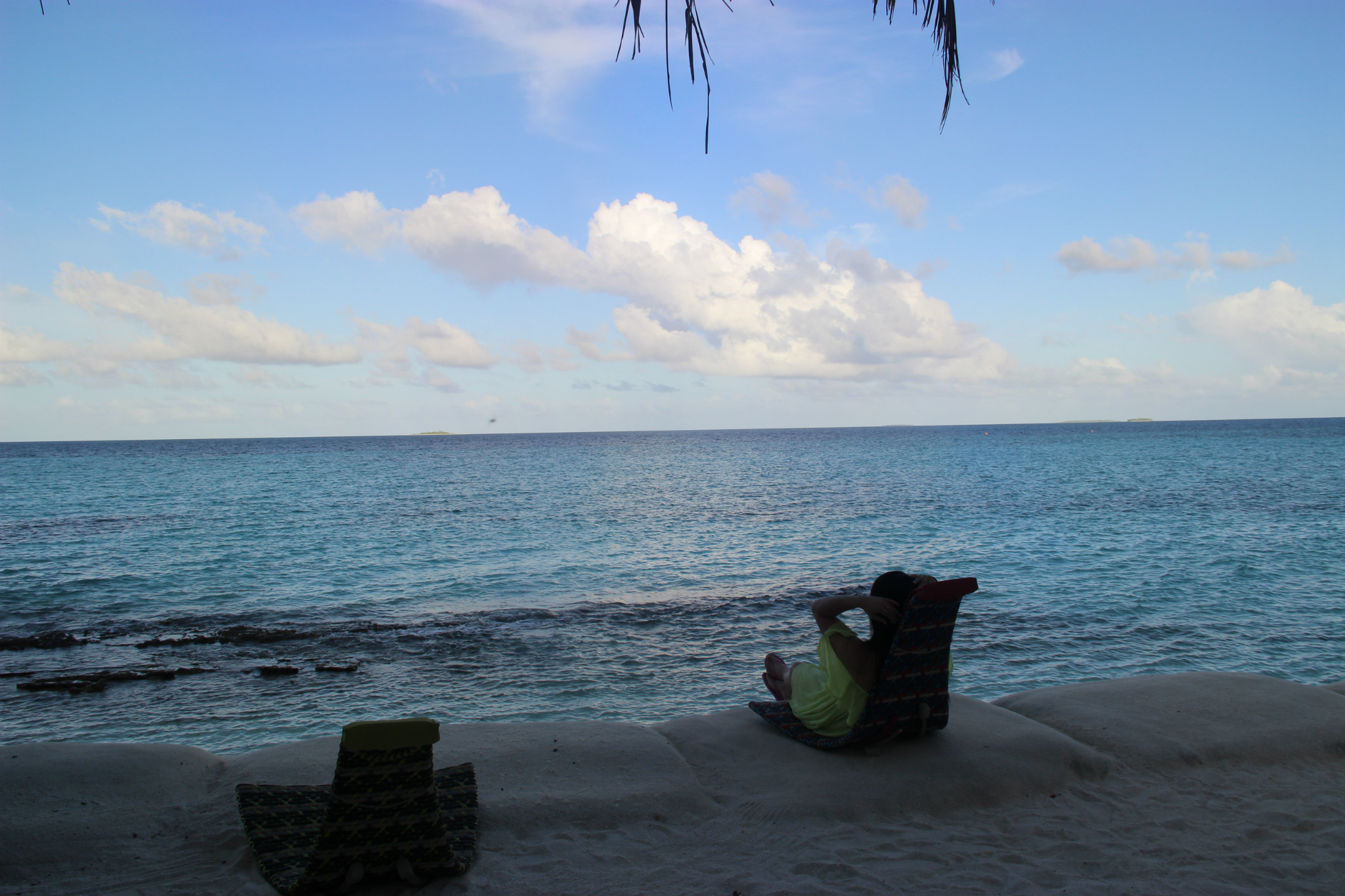 早餐过后,太阳渐渐强烈了起来,上午11点左右是德国人陆续出来活动的时间了。R岛是德国人投资建成的,之所以浮潜好是因为最大限度的保护了原生态,如热带植物和小动物,还有珊瑚和鱼群,同时也禁止带走珊瑚和沙子。有时候真心羡慕外国人的生活方式:他们在岛上一待通常是一两个月,至少也是几十天,每天趁着大太阳晒晒日光浴,坐在沙滩边捧着一本书一看就是一天,或者一两人就下海泡着,老人们喜欢坐在房间门口的观赏沙发上下下棋,悠闲自在,时光在他们那总在静静的慢慢的……