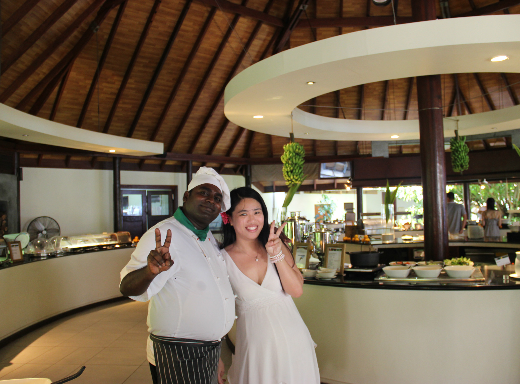 晚上的饭菜比较爽了,一向大多以西点为主的自助餐厅变成了中国厨房,今天有炒饭!可以自己选择几个小菜,放在米饭或扁粉或方便面中,交给厨师,他帮你一块炒出来,味道真的不错!不过外国厨师口味都比较淡,盐一般都放得很少,也不会放辣椒。但是,能吃到这样“地道”的中国炒饭,也是幸福了。 8.2今天是我们要离岛的日子了,昨晚小黑就把通知书放在了床头,提醒我们12点之前要把行李清理好放在房间外,最迟在下午5:00check out,离开的快艇将会在5:30在主码头等待。最后一天,相约在我们的水屋进行最后一次浮潜,浮潜后就要收拾行李了。
