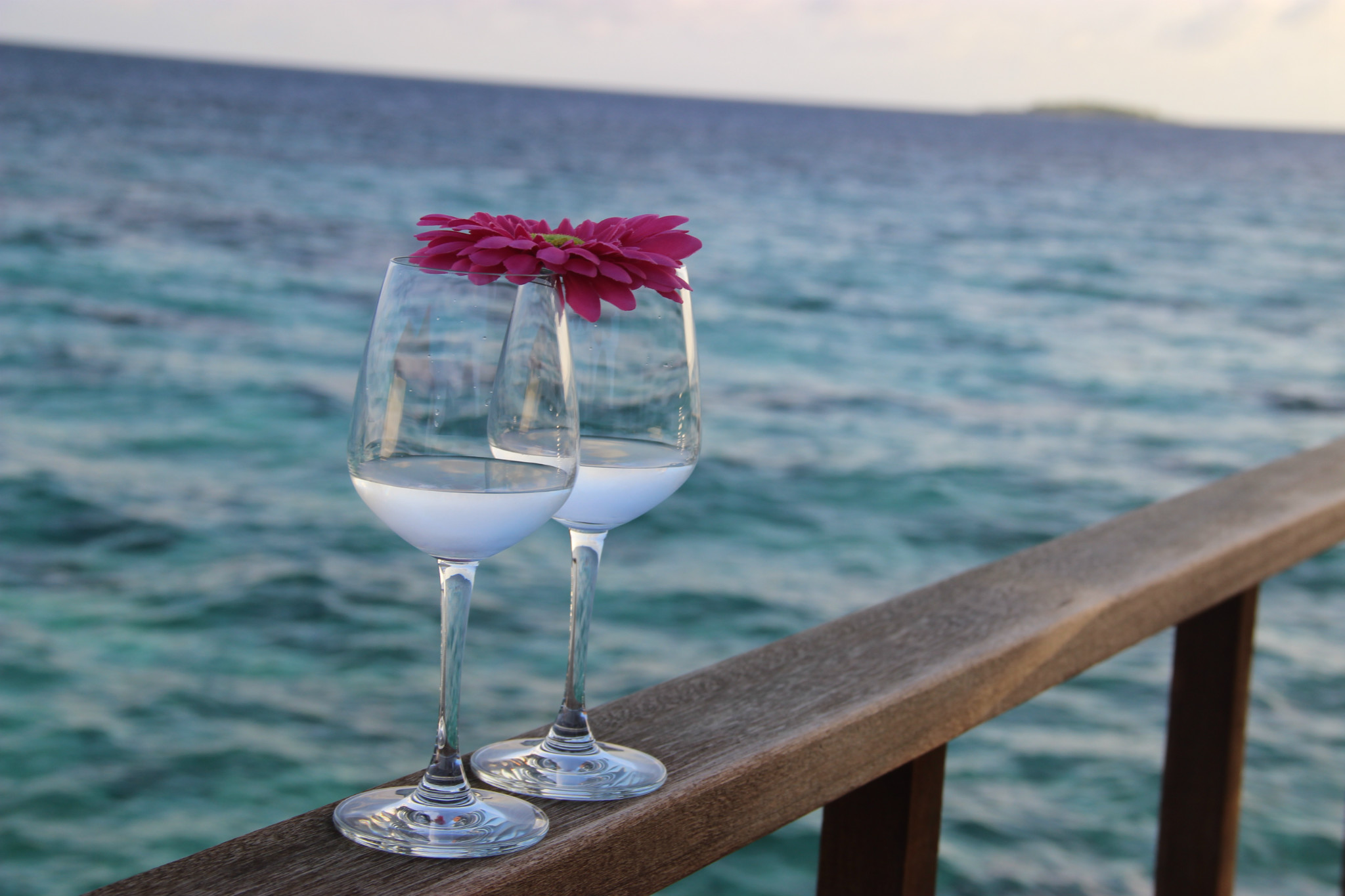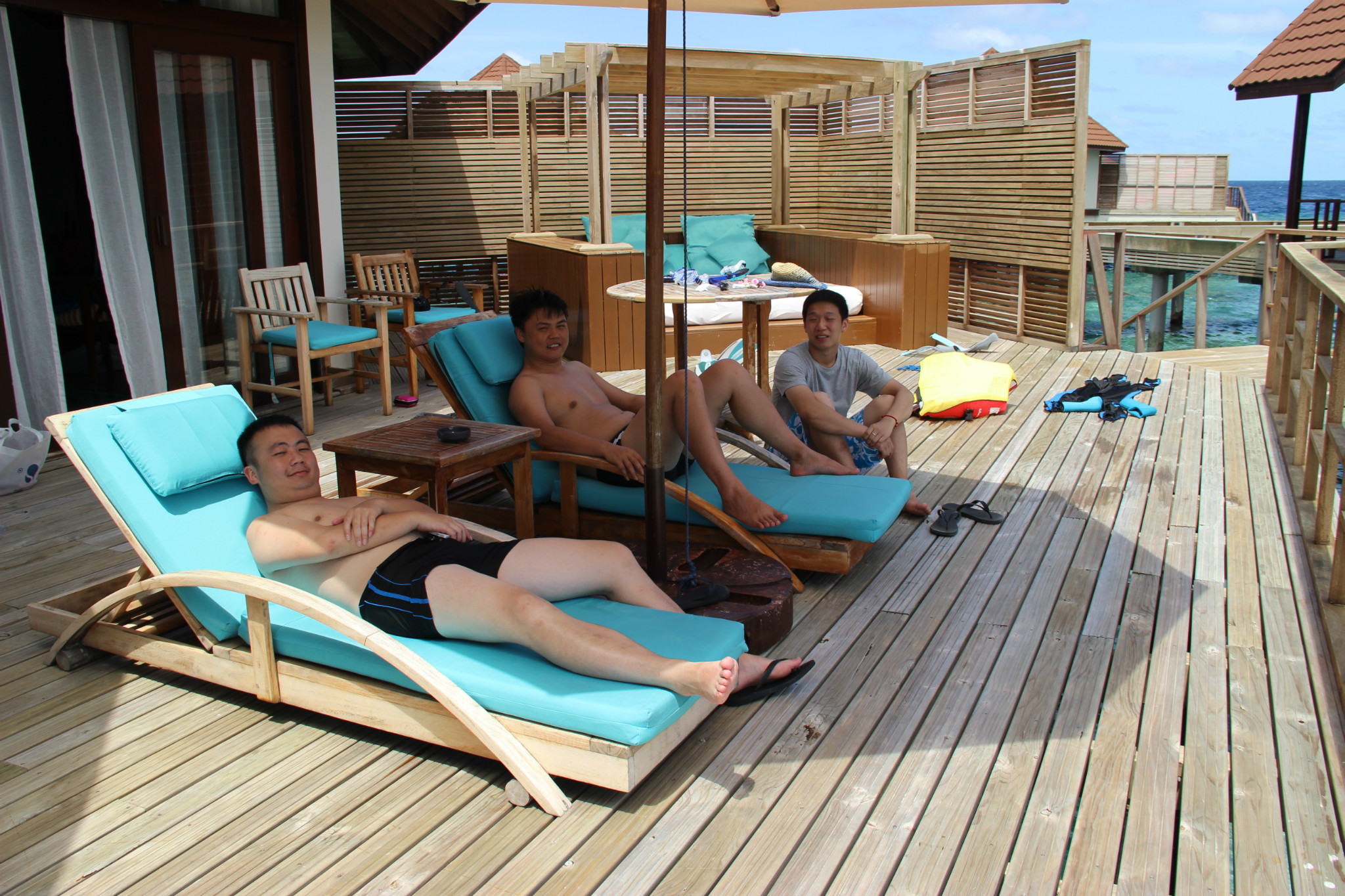 8.1我们在水屋睡得很香,原本还有点害怕晚上海浪声太大会不会睡不着。但是房间门窗的隔音效果非常好,一拉上就很安静,蜜月套餐中的香槟被我们带到水屋来了,真想跟老公坐在露天阳台上一起试试喝着香槟,听听海浪的声音,看看璀璨的星空,一定会很享受吧。但是,每天我们回来的时候都11点多了,加上时差的原因,一回来就想休息,所以想法没有好好落实。今天我们起来得比较晚,听起来得早的小伙伴说今天云层很厚,也没有看到日出。
