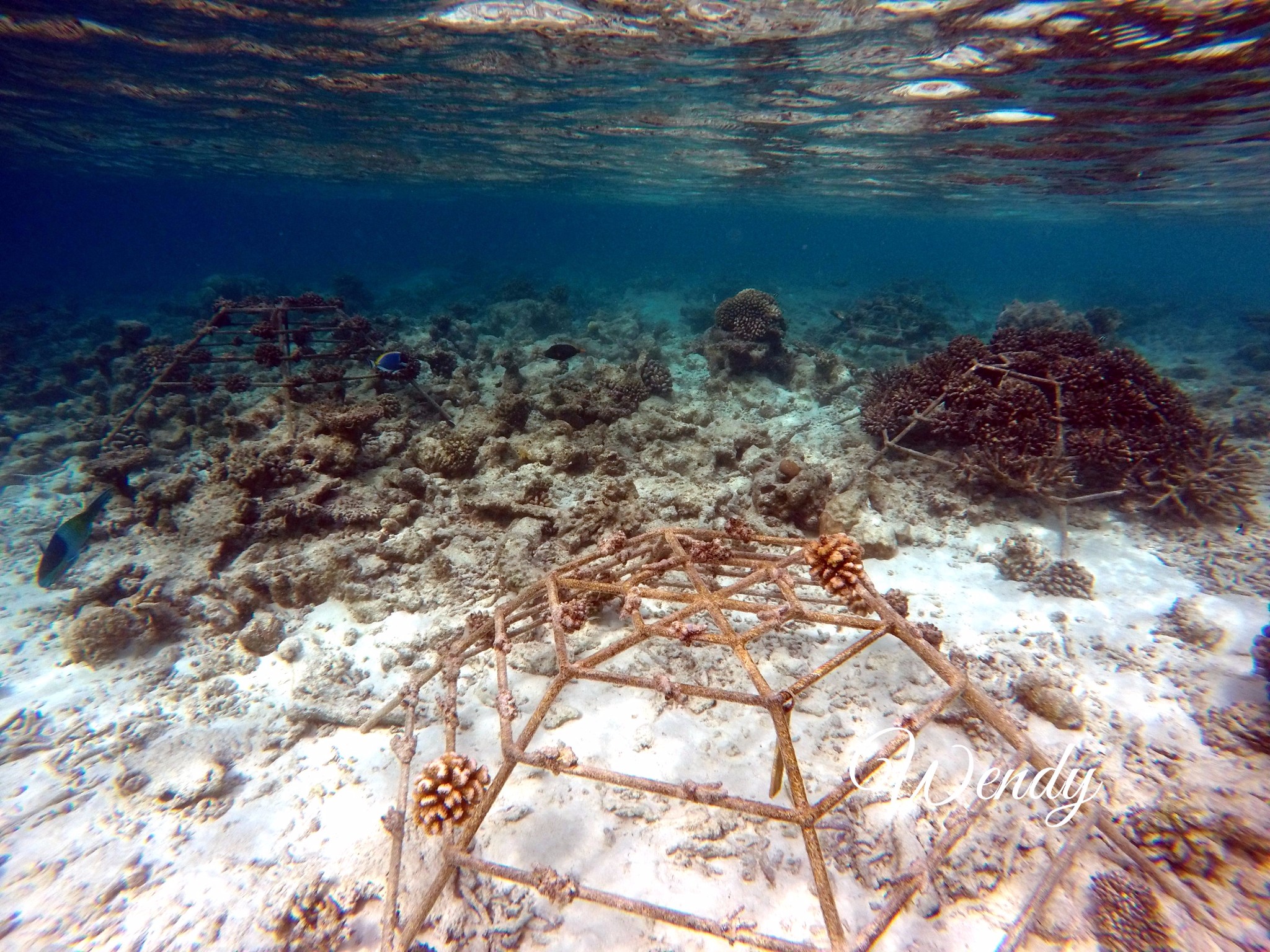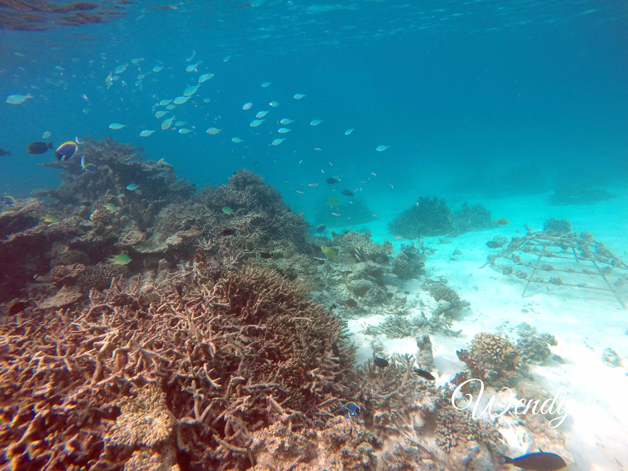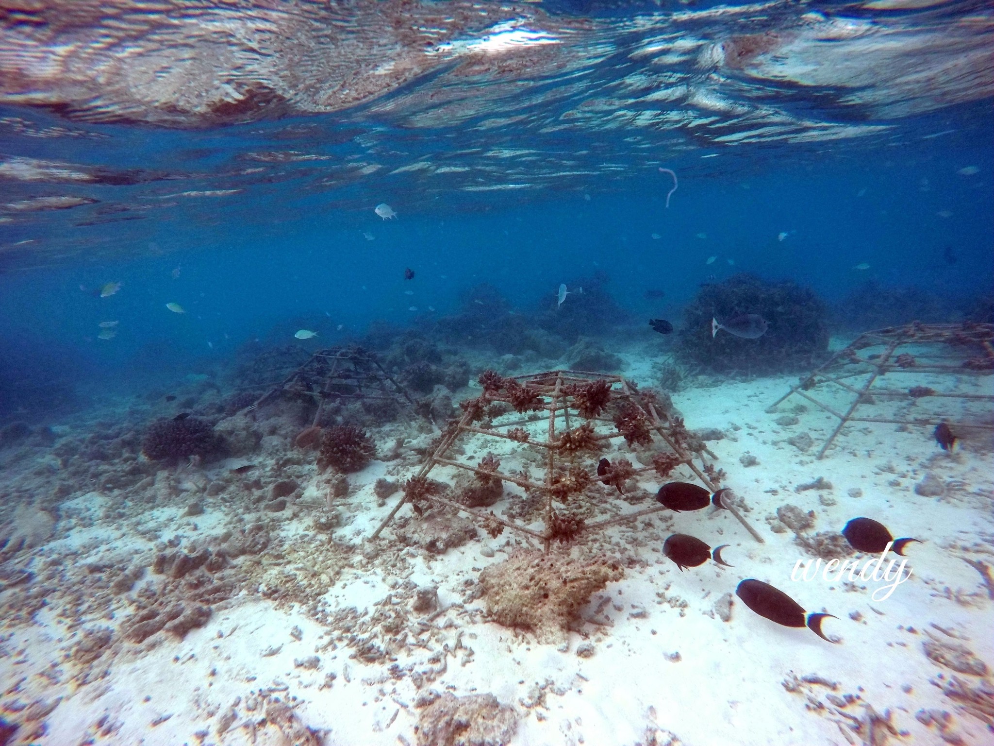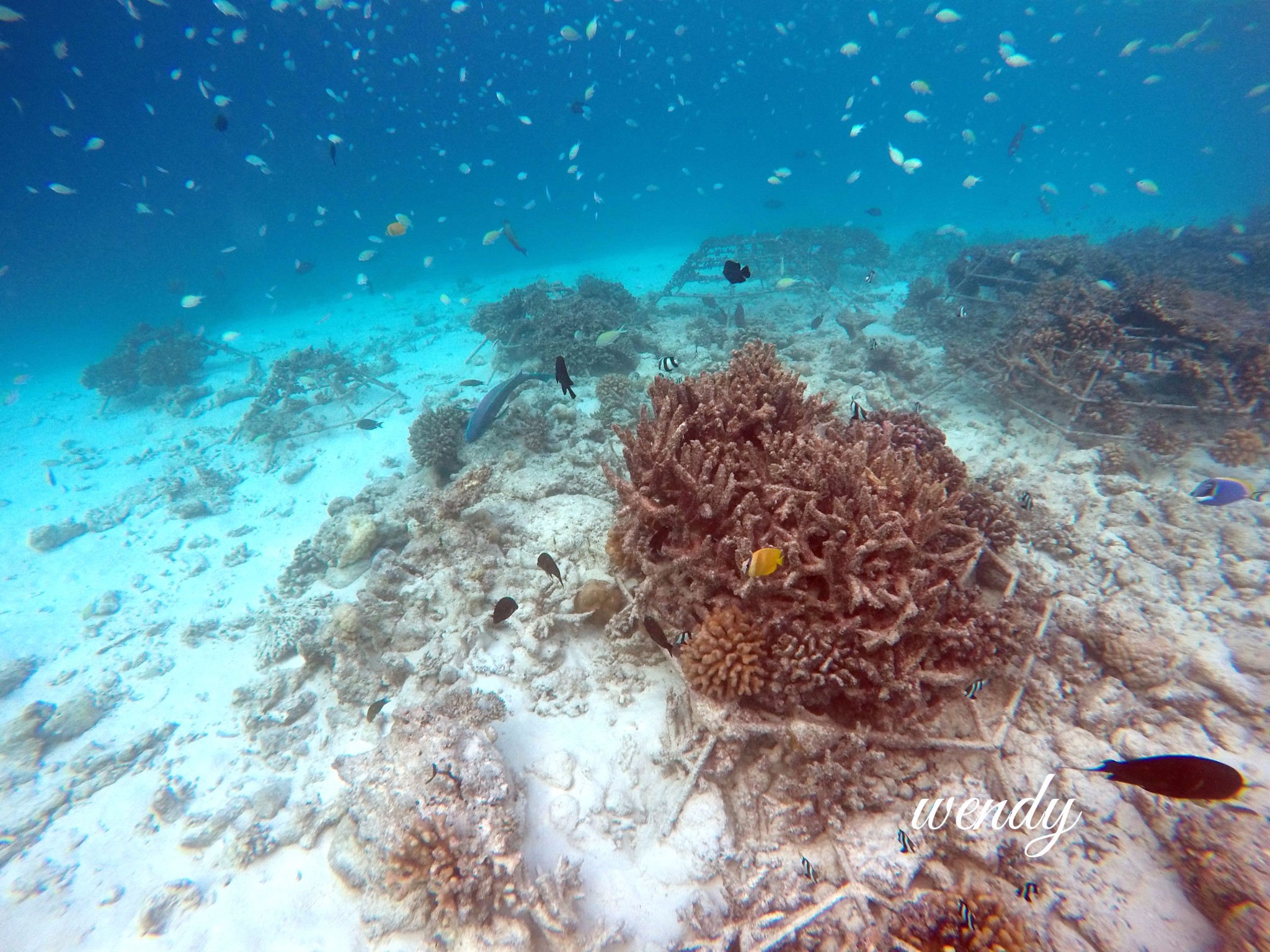 四季兰达浮潜靠豪华沙屋这一侧比较好,beach villa with pool,也是靠近码头和阿拉伯餐厅这一侧比较好。以下图片都是实物拍照,海里确实有很多种值珊瑚架,但是鱼确实很多很多,可能会有一些小伙伴说为什么会有这么多种植珊瑚啊,因为四季比较环保,为了保护珊瑚,四季酒店都有种植珊瑚的一项活动(是属于自费的活动),会在珊瑚架上写上种植人的名字,然后每年会汇报珊瑚的生长情况,这其实也是另外一种体验,感觉一辈子和四季兰达都在一起。自己种植的珊瑚像自己的宝宝一样,慢慢长大。虽然珊瑚一年才能长几厘米。