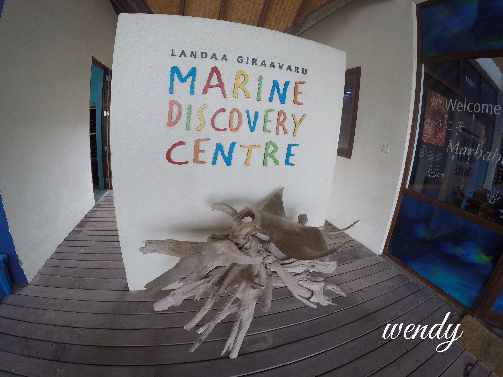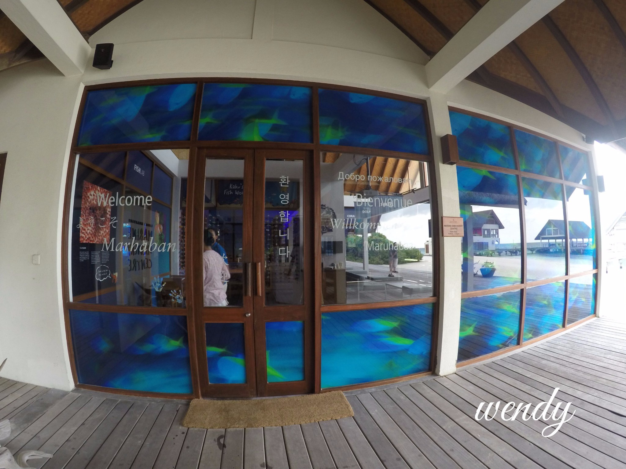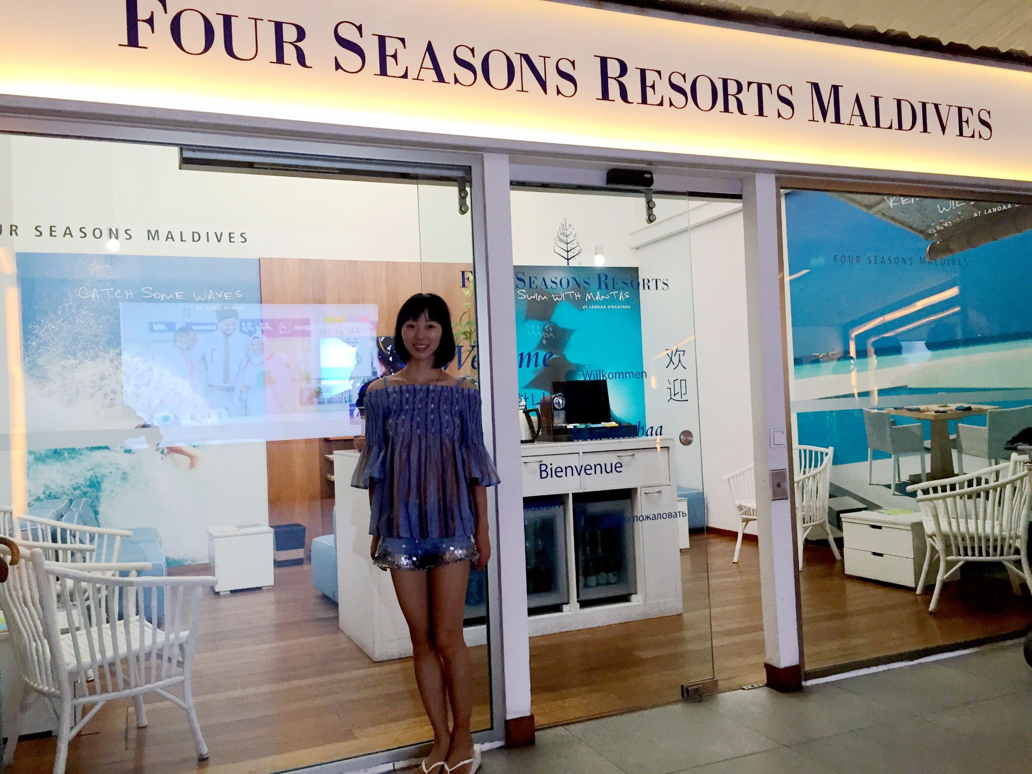 四季酒店-兰达吉拉瓦鲁岛度假村四季休息室的门上都是写了几种国家语言,有英文 ,中文 ,还有韩语,还有我不认识的语言