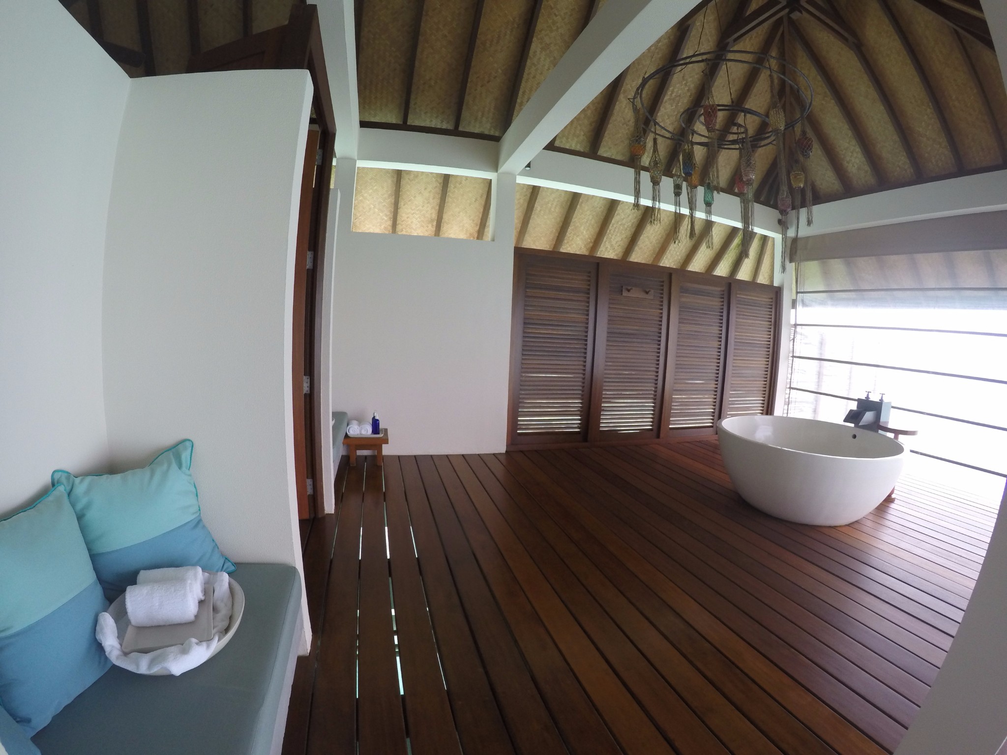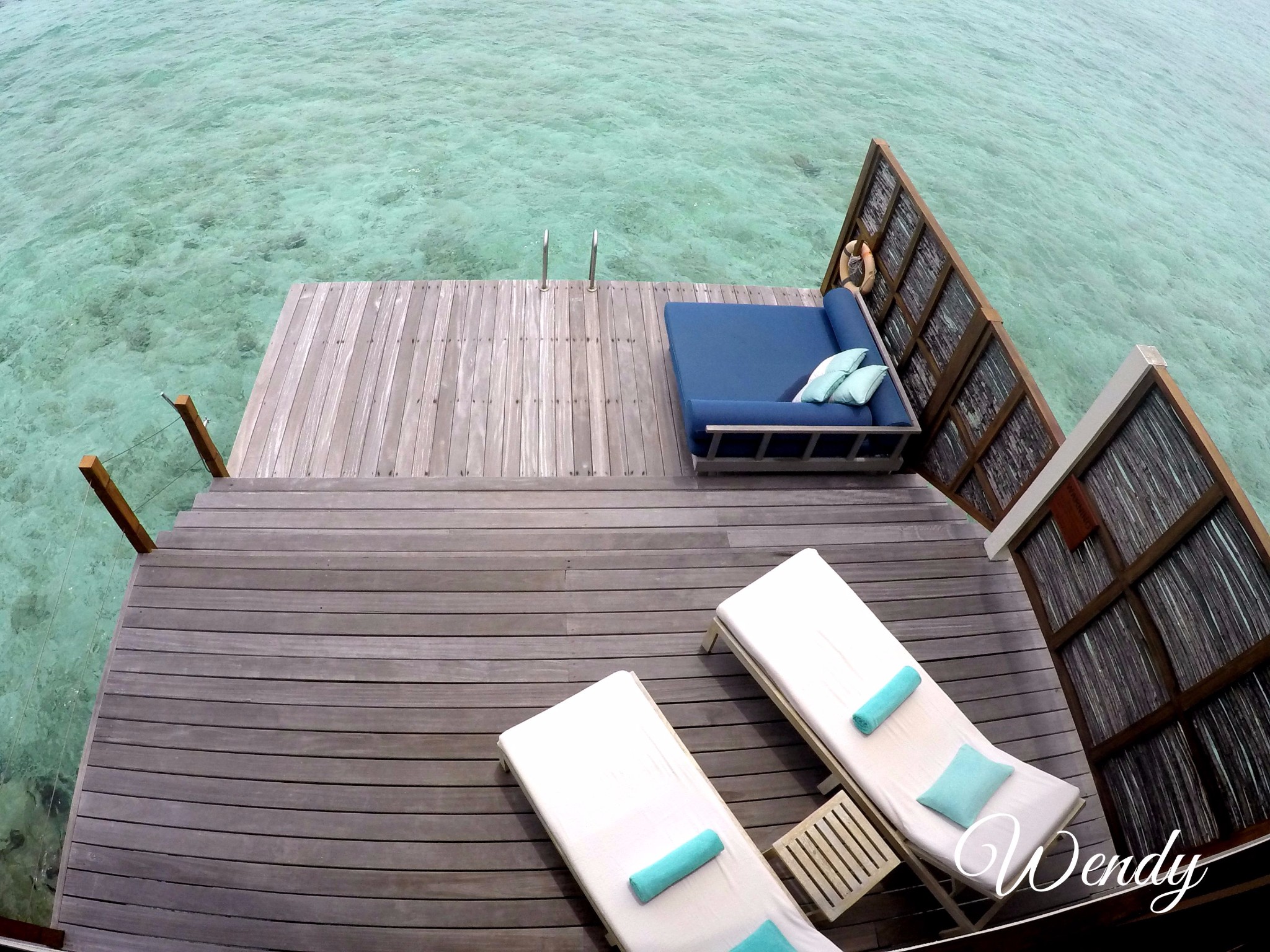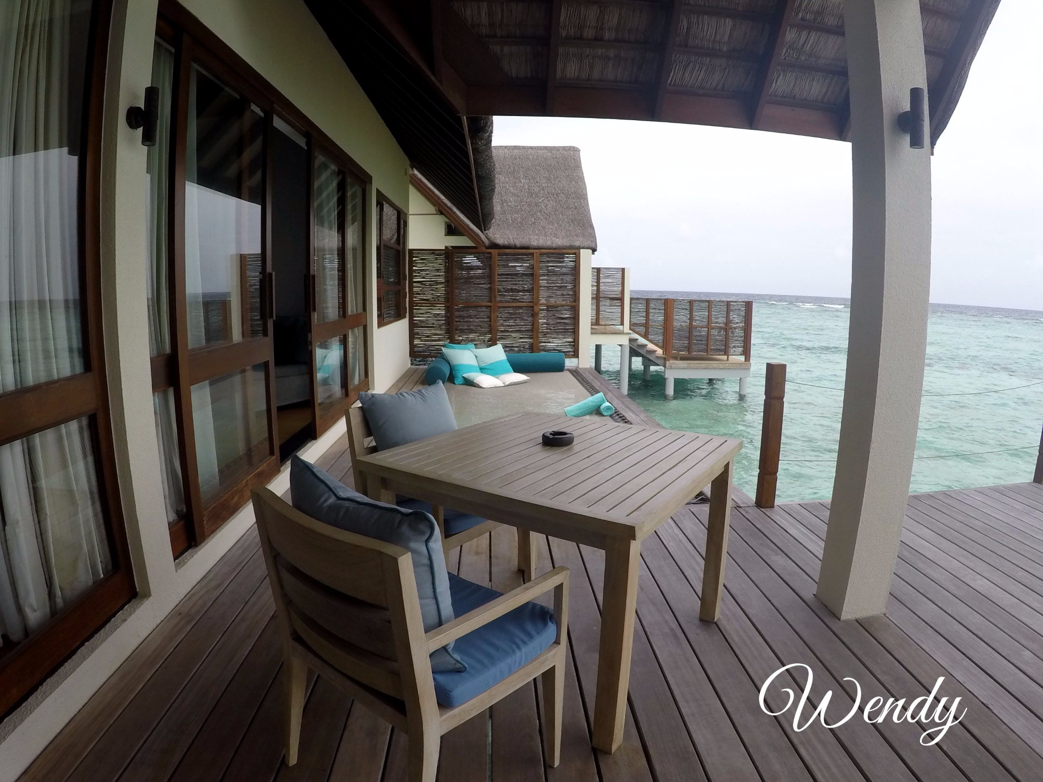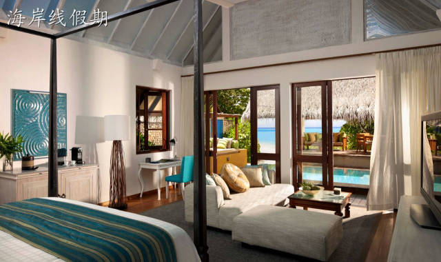 四季酒店-兰达吉拉瓦鲁岛度假村下面来看水屋,Sunrise/Sunset Water Villa-- 日出/日落水上别墅(建在水上) ,最主要的区别是一个是面向日出,一个是面向日落,日落侧的水屋是面向拖尾沙滩的。日出直接面向大海。内部基本都是一样的。