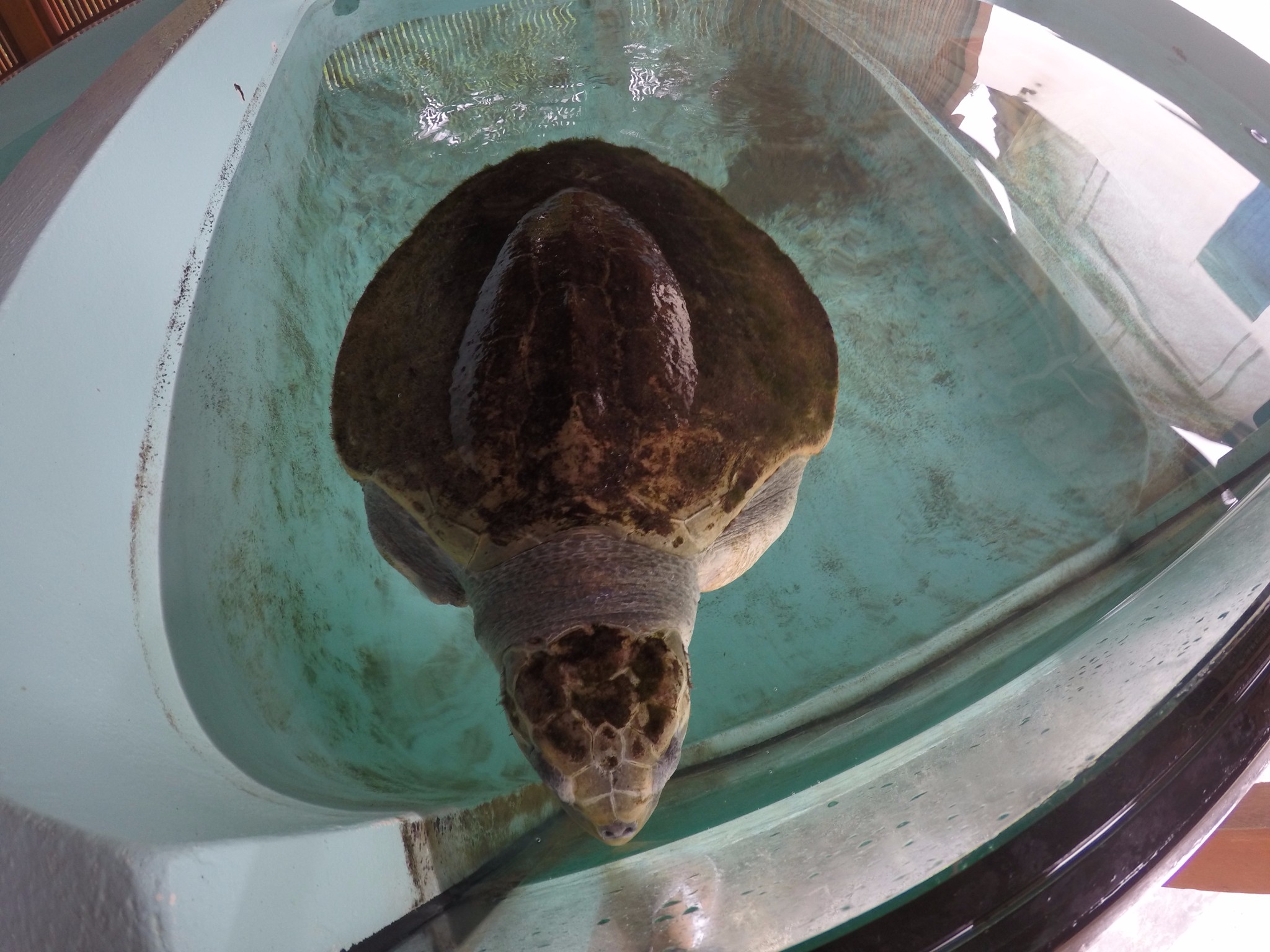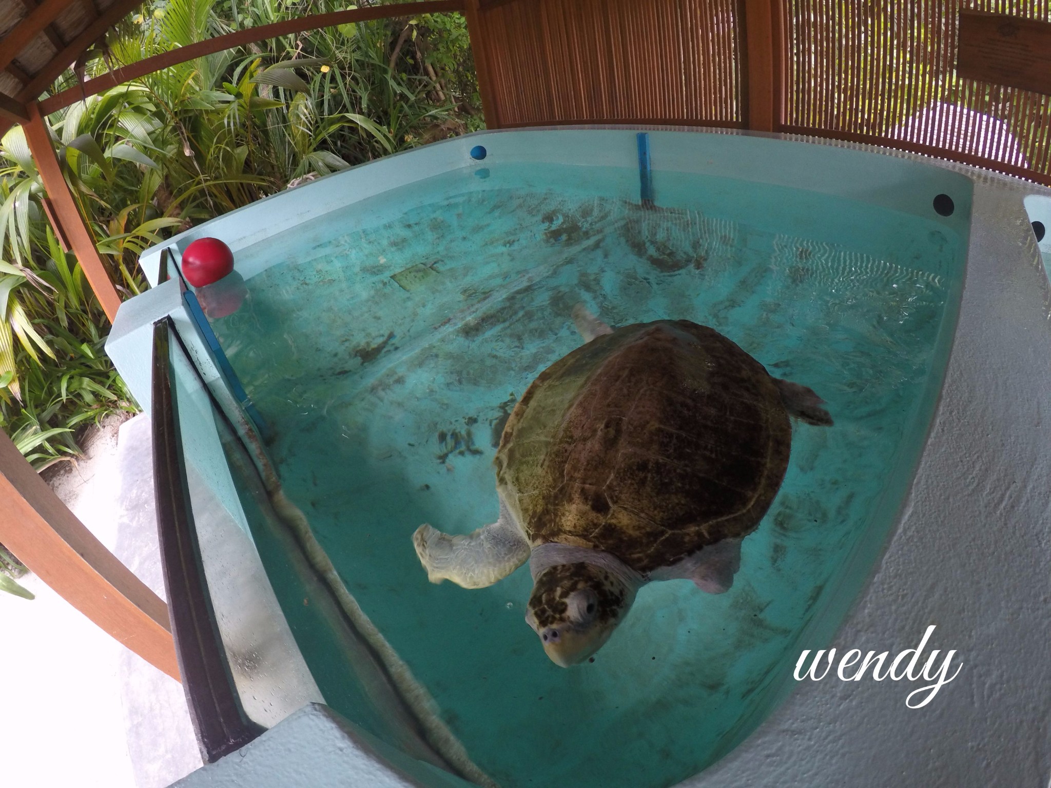 四季酒店-兰达吉拉瓦鲁岛度假村还有一只受伤的海龟,前面2只脚都没有了,因为被困住了。