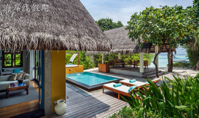 四季酒店-兰达吉拉瓦鲁岛度假村Beach Bungalow with Pool--带泳池的海滩屋 和 Beach Villa with Pool--带泳池的海滩别墅 的差别是:方向不一样,beach villa面向的是日落那一侧,beach bungalow是面向日出那一侧。并且沙滩面积大小不一样,beach bungalow的前面的沙滩面积小,但是beach villa是面向拖尾沙滩那一侧,面积很大。还有游泳池大小不一样,beach bungalow的泳池会比beach villa的要短,但是都是赛道泳池。 下面上一些Beach Bungalow with Pool--带泳池的海滩屋的照片,沙质一样很不错,但是前面会有少许的礁石或者放浪提。
