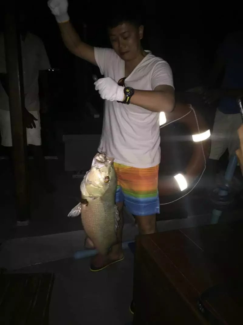 切鱼肉的小黑! 钓鱼历时两个小时,结果老公钓到了全船最大的一条鱼,瞬间被闪光灯笼罩,太帅了!钓到的鱼第二天在秘鲁吧给我们做好吃,这条大鱼简直了,我们邀请船上的其他夫妻一起来吃。