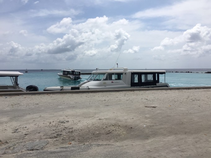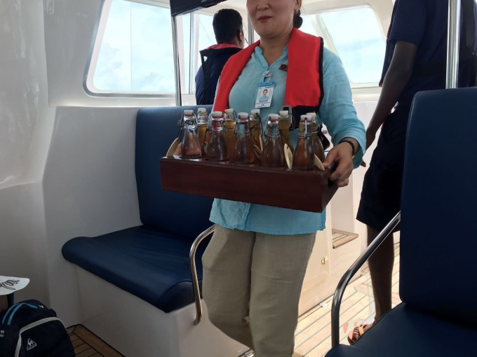下了内飞飞机,Outrigger的快艇来接我们了。在快艇上还有冰水和冰茶喝,Outrigger的管理人员统一穿蓝色衣服~