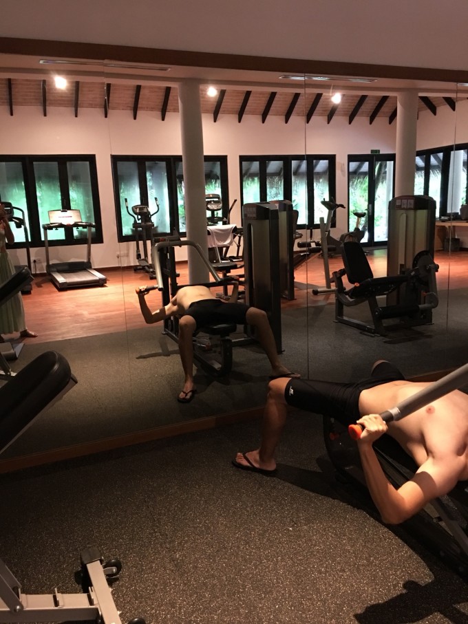 等待的时间太长,老公决定去岛上的健身房嗨一嗨。