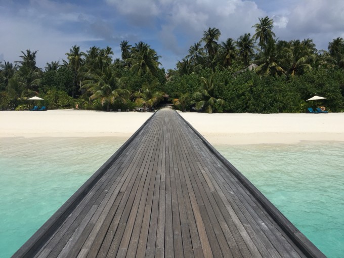 航程大约30分钟这样,终于到了梦想中的目的地!工作人员会拿着欢迎饮料出来迎接,给我们挂上手编的挂饰,然后映入眼帘的就是码头的这一条桥和蓝蓝的海水,忘记了之前旅途的疲倦,心情瞬间好起来~