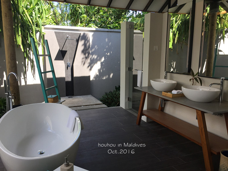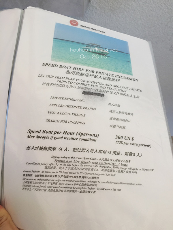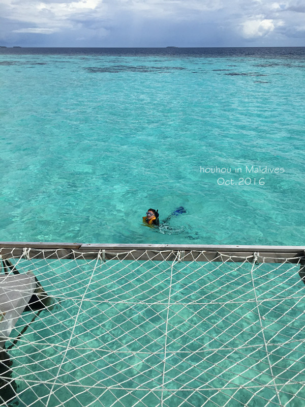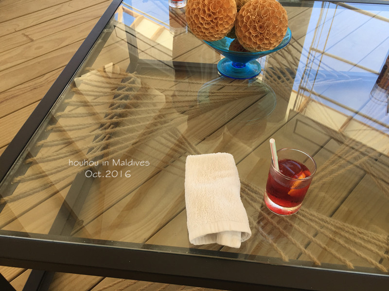 还有准备带各种游泳圈的朋友们请注意:一定要带绳子,把你的游泳圈拴在水屋的栏杆上,比如我的游泳圈就被吹到了隔壁阳台上,还好栓了绳子,否则分分钟漂到海里去,一去不复返哦~想拍合照的一定要带三脚架,因为在岛上是不会经常碰到其他人可以帮忙拍照的。另外,我们带的转换插头和接线板在阿玛瑞都没有用过,但是在马累的酒店用了一晚,所以还是有必要带的。说到小费,我们找朋友换了40张一元面值的美金带去,每天早上放一张在床头,搬行李的小黑给一张,一共也就用了十几张而已。wifi的话阿玛瑞是全岛覆盖,用户名是房间号,密码是先生的姓!网速并不是特别快,但是刷微博发朋友圈完全不成问题