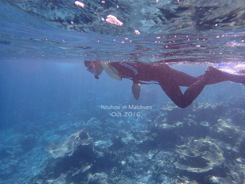 当天下午,我们各自在沙屋的外面浮潜,又约好去无边游泳池集合,于是尹同学拉着我一直从我们住的沙屋游到了游池边的海域。几个男生约好去深海的地方浮潜试试,于是他们游到了大海浅蓝色和深蓝色交界的地方。回来以后我问尹同学:那边好看吗?他说好看。我问:能踩到地吗?他回答说可以。我说:好,明天带我一起去。 于是第三天早上,尹同学带我去深蓝色的地方啦,but,这也是毕生难忘的一次危险经历。他嫌走路拉着我太累,所以这次他穿上脚蹼,采取仰泳的姿势,用脚蹼发力前进,手拉着我。我继续把头埋在水下,看风景。游着游着,我发现面镜进水了所以准备站起来调整一下,可是我竟然发现我踩不到地,当时大脑一片空白,马上抱住他的脖子,据他说并不是“抱”,而是“勒”。我只听到他喊:你别勒我脖子,我也踩不到地。我心想:完蛋了,死定了!当然我忘记了:我穿着救生衣呢。最后他只能死命地把我拖着往回游,终于到了能踩到地的地方,我走着上岸,跟自己说:我再也不要下水了!!!大概我永远也无法克服对水的恐惧了