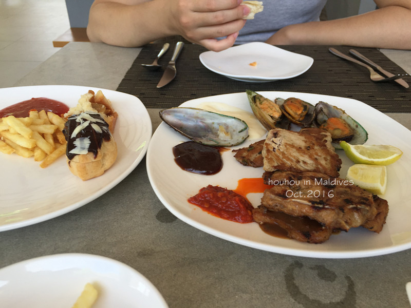 当然了,早中晚三餐都是有饮料和咖啡的,早餐可以喝果汁和咖啡,中晚餐饮料基本上就是芬达、雪碧、可乐。每个房间也有免费的茶包和胶囊咖啡机,但是我尝了房间里的咖啡,并不好喝。在这里早晚饭都是7点到10点,中饭是12点半到两点半。大部分时候我们都是去拼一个大桌,几对小伙伴坐在一起吃。菜式还是蛮丰富的,也许是因为这个岛上中国人比较多,所以东西很合我们口味。小黑们也会直接用中文说“雪碧”、“芬达”。所以说在岛上交流完全不成问题,有中文管家,餐厅也有中文服务员,就连小黑们也会简单的中文。早餐的话面包、鸡蛋、煎饼、炒面、炒米粉都有,果汁也特别好喝,都是鲜榨的。中饭晚饭有各种牛排、鸡排、炸鸡、薯片、咖喱饭。 有的蜂蜂说早晚餐就够了,中午不吃也可以,可是为嘛我们每餐还没到点,肚子就饿了呢?