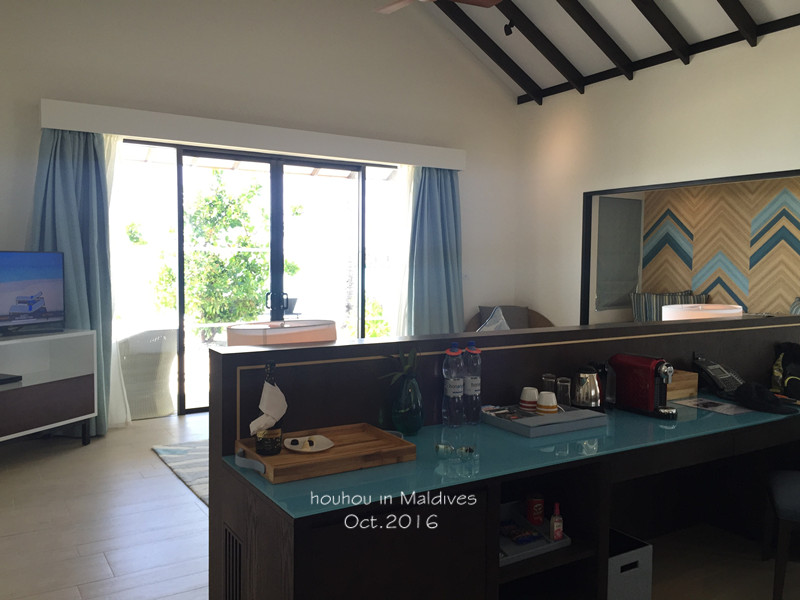 于是就有小黑开着电动车把我们送到了我们的沙屋房间:228,我对房间的要求并不高,有些小伙伴会查询自己要去的岛哪些房间风景好,哪些房间浮潜条件好,提前跟酒店商量预订那些房间,第一我怕麻烦,第二毕竟商量了也不一定百分之百能预订到。总之,我对这次的沙屋和水屋都挺满意的,毕竟第一次来,也没有比较啦~