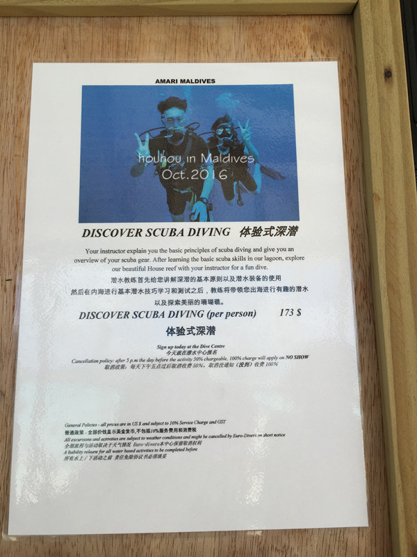 来之前Wendy告诉我们,岛上会送一次教练带我们出海浮潜,看了其他蜂蜂的游记,说是教练带着自己游到远一点的海域去浮潜,也有蜂蜂说本身不会游泳,在海里练了半下午就可以跟教练去了。我想我应该也ok吧。于是第二天吃早饭的时候,我们十个人商量着一起去预约第三天早上的出海浮潜,另外一对夫妻预约了坐船出海浮潜,所以不能跟我们一起了。水上中心的接待人员是个新加坡籍的深潜教练,他劝我们先去体验一下付费的付钱项目,如果可以适应的话再去体验这个免费的,因为免费的只有一次预约机会,如果取消不去的话就很浪费。他提到几点:1.教练不会等任何人,他游泳也不会太慢。2.游过去的过程中有一段海深30米,脚是不能着地的。3.有些人预约了这个项目,去体验了以后是哭着喊着回来的。我们十个人商量着:大不了我们十个人一起,跟不上的话就自己回来咯~无奈的教练帮我们填了预定信息以后,我们还各自租借了脚蹼准备自己回去体验一下。另外,我们还看了一些付费的水上项目,我跟尹同学商量着这次免费的浮潜体验完了,再去体验一下深潜。